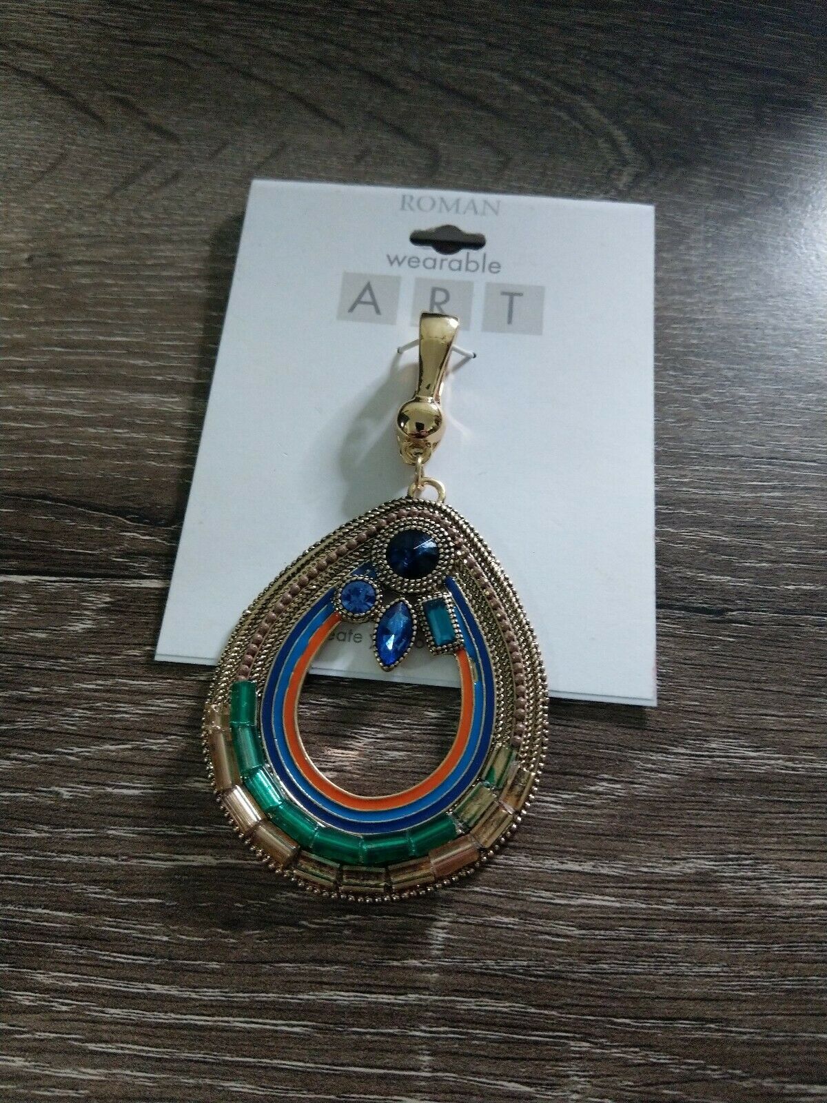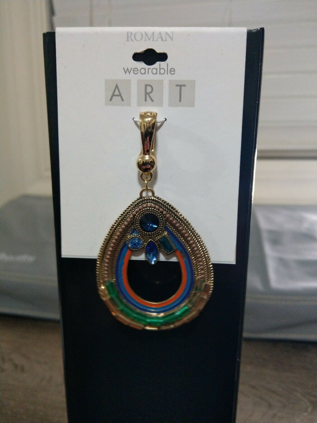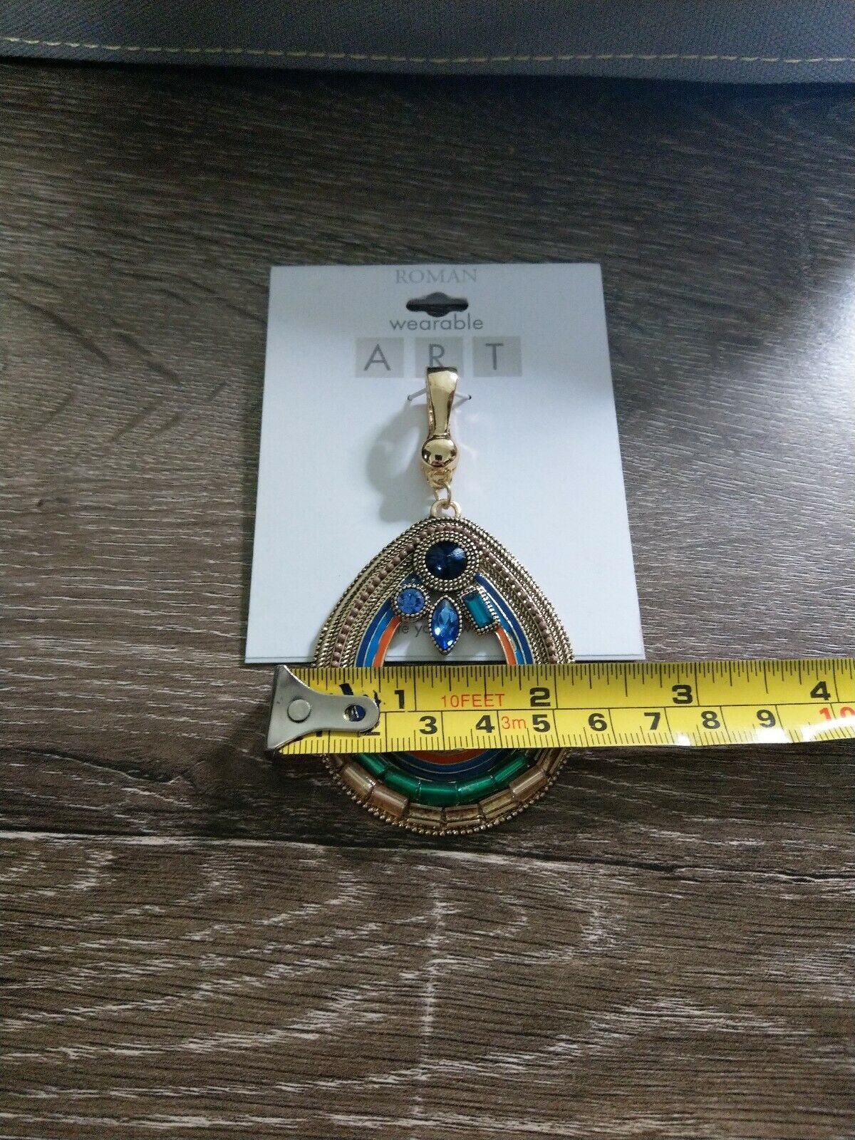 Wearable art by roman, Pendant Gold, Blue, Green. Missing a few Gems. Condition is New with tags. Shipped with USPS First Class Package within 24 hours.