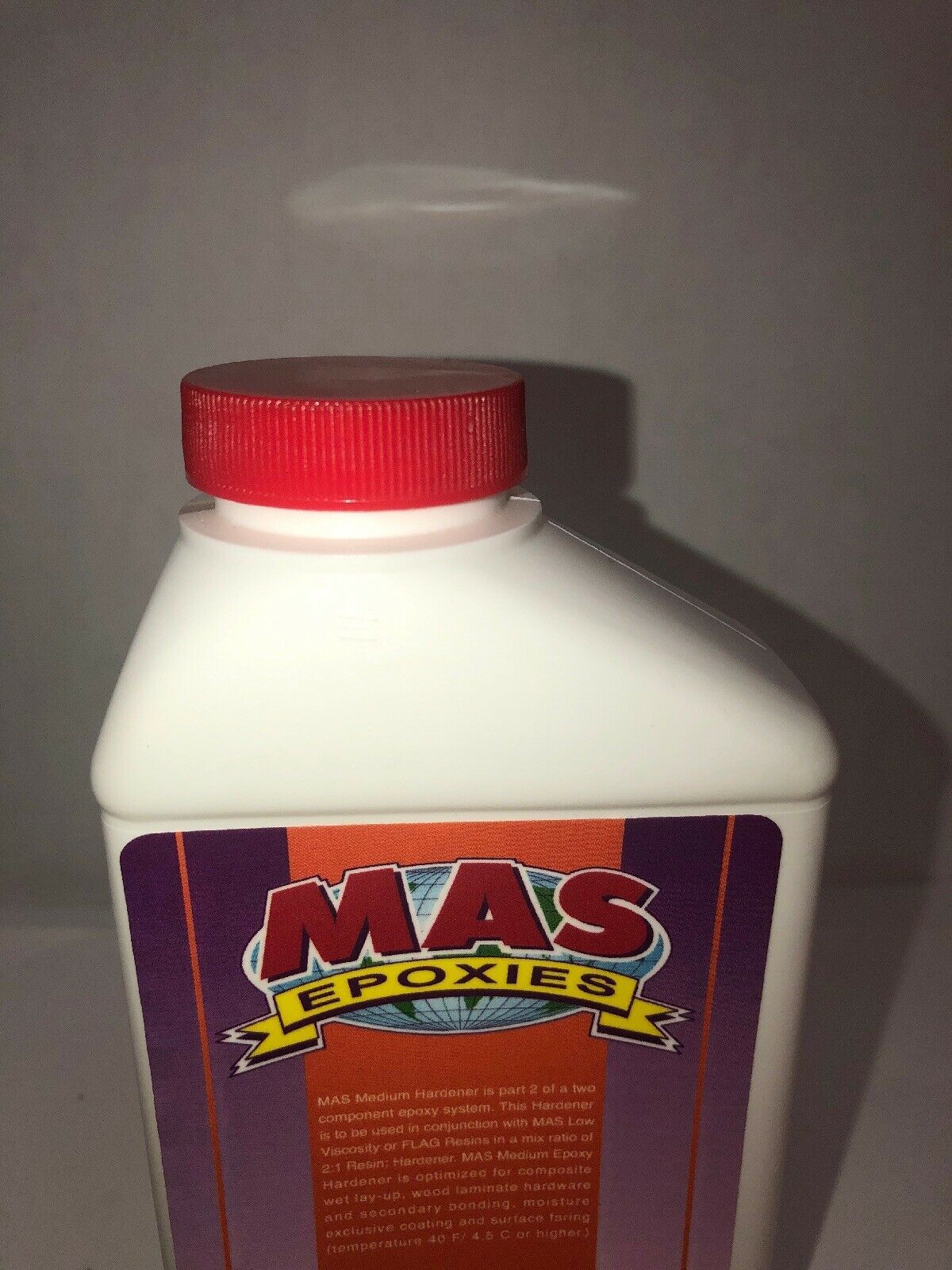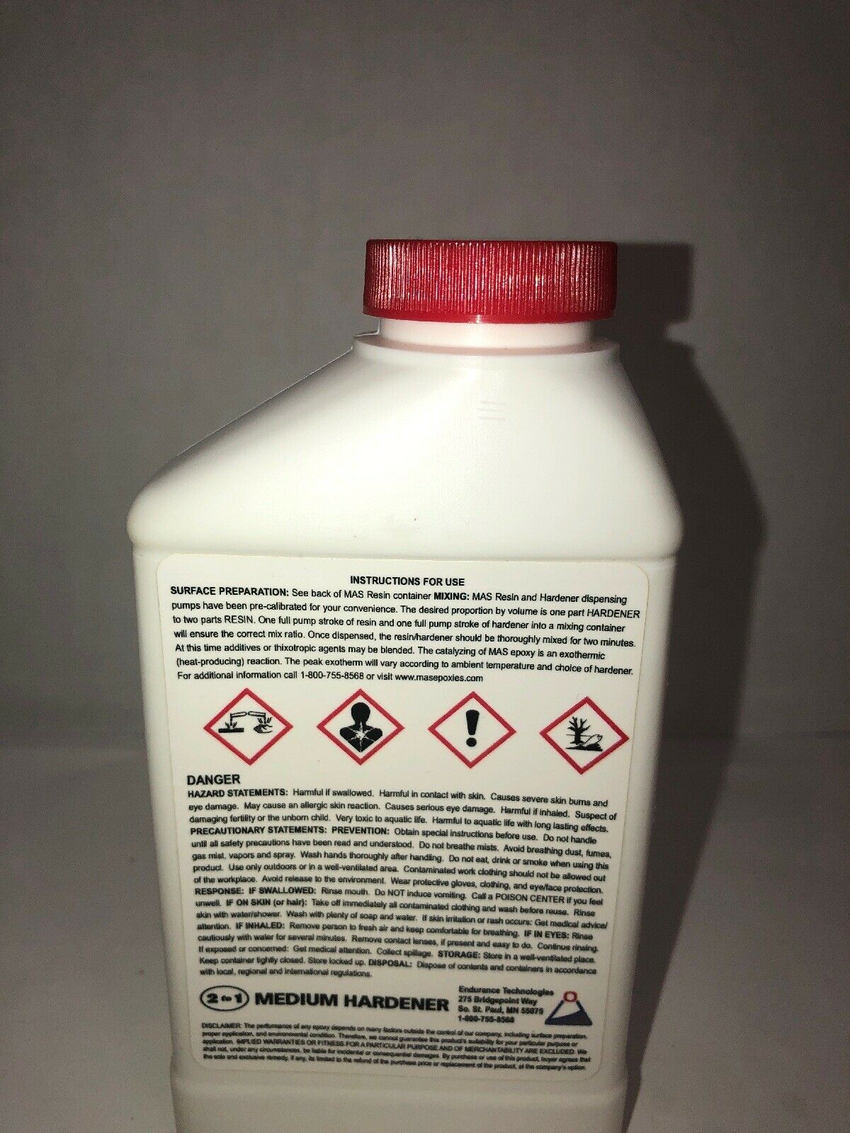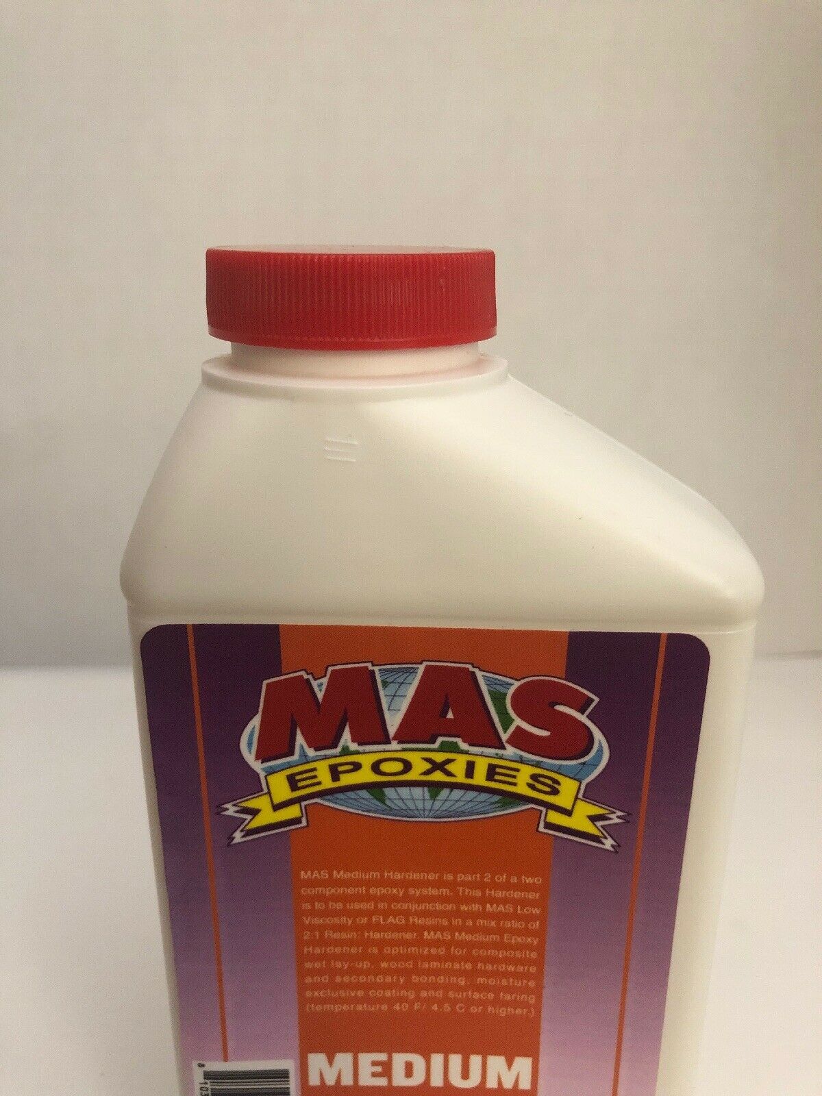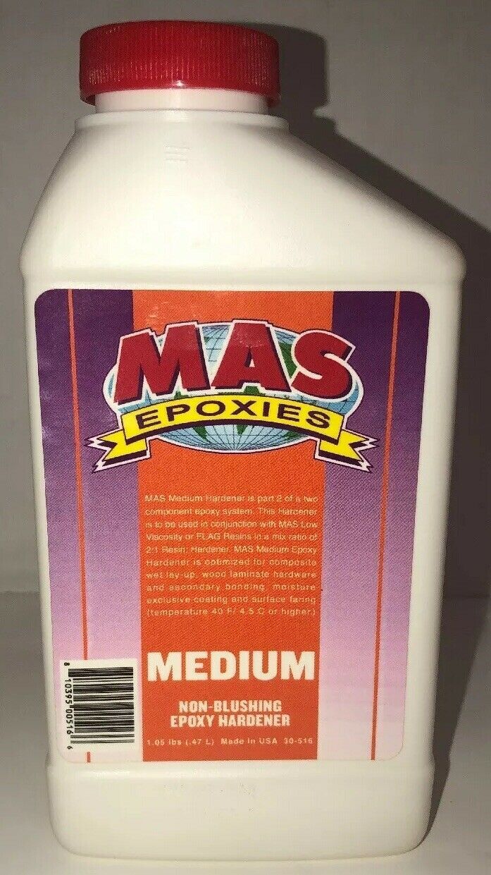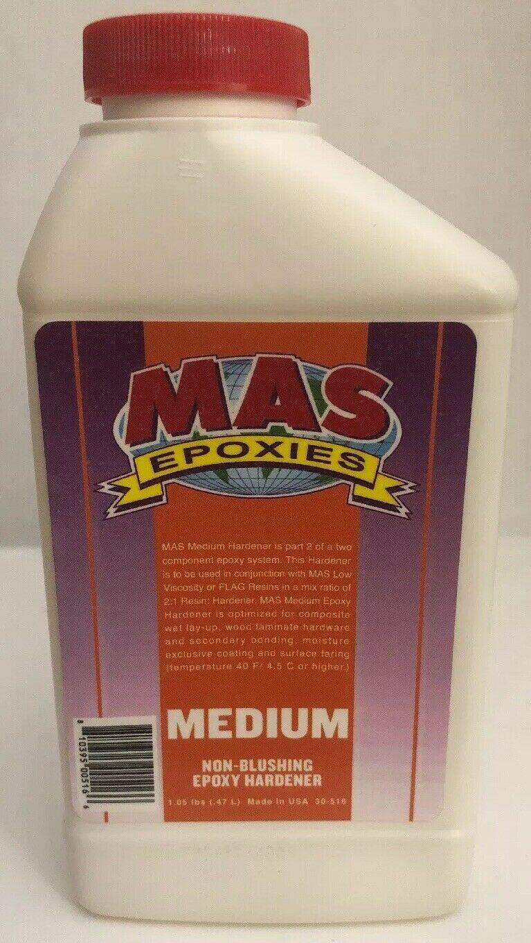 15.98 Onces Large Bottle Mas Medium Epoxy Hardener by Endurance Technologies.Medium Epoxy Hardener. After mixing resin and medium hardener, you have 30 minutes to get it out of the cup and approximately 4 hours of open working at 70F. Good ultraviolet stability. Excellent barrier coating. Cures in high humidity. Recommended for large surface coatings and laminations. Blendable with fast hardener for customized working and curing times. Mix with appropriate MAS resins in a 2 parts resin to 1 part hardener ratio.