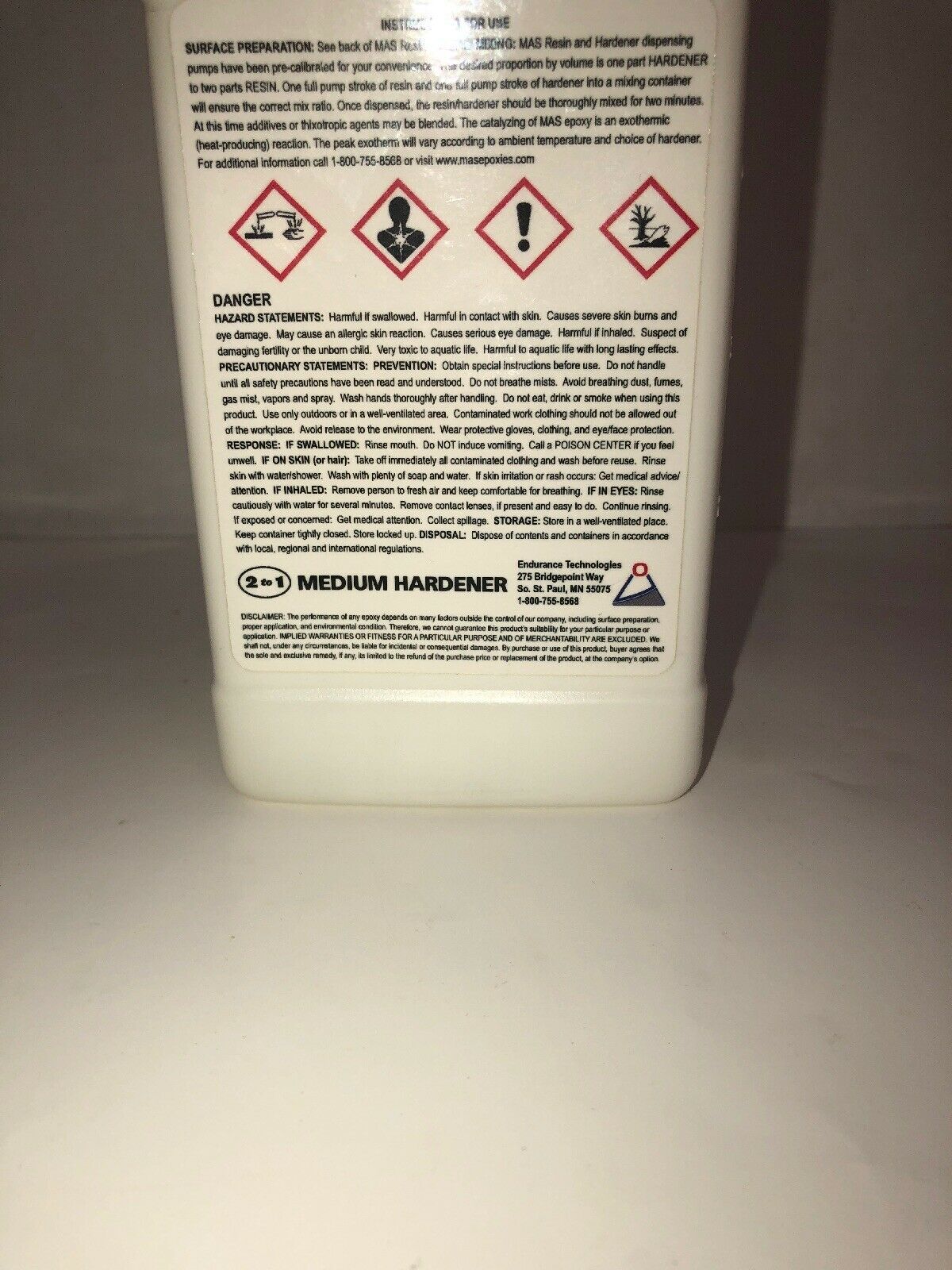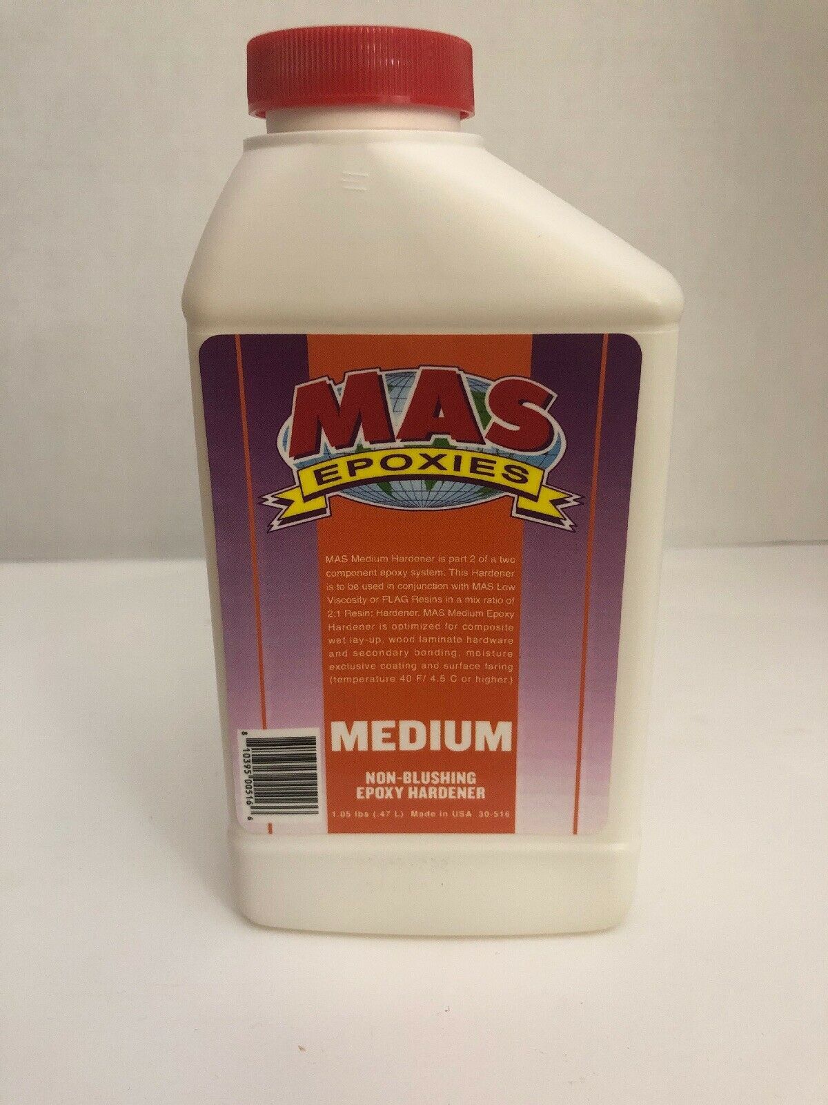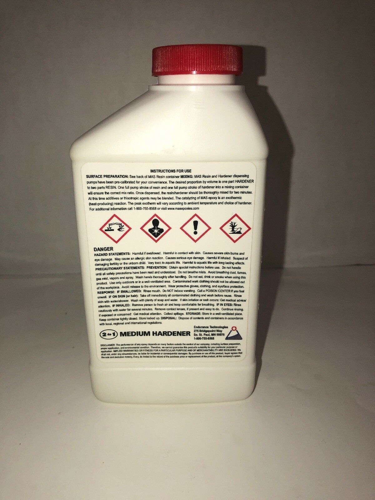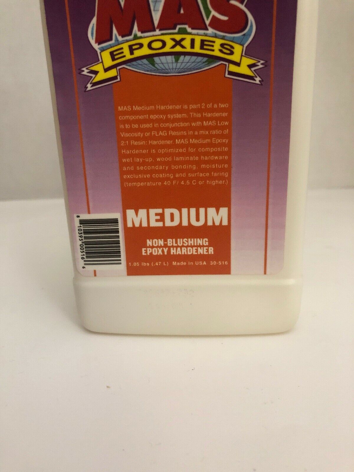 15.98 Onces Large Bottle Mas Medium Epoxy Hardener by Endurance Technologies.Medium Epoxy Hardener. After mixing resin and medium hardener, you have 30 minutes to get it out of the cup and approximately 4 hours of open working at 70F. Good ultraviolet stability. Excellent barrier coating. Cures in high humidity. Recommended for large surface coatings and laminations. Blendable with fast hardener for customized working and curing times. Mix with appropriate MAS resins in a 2 parts resin to 1 part hardener ratio.