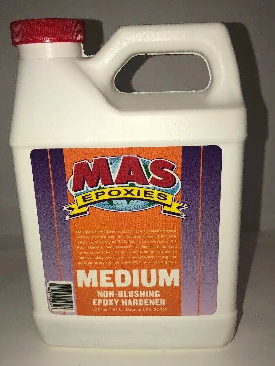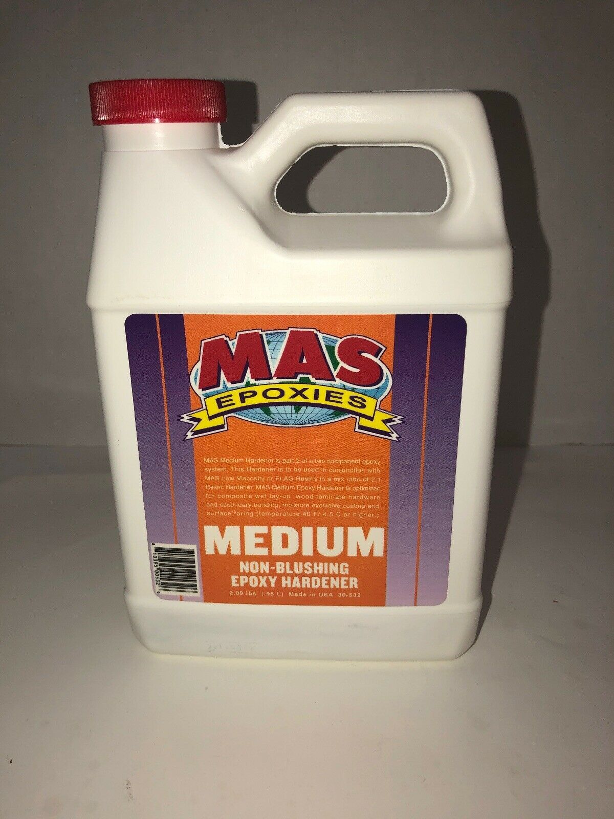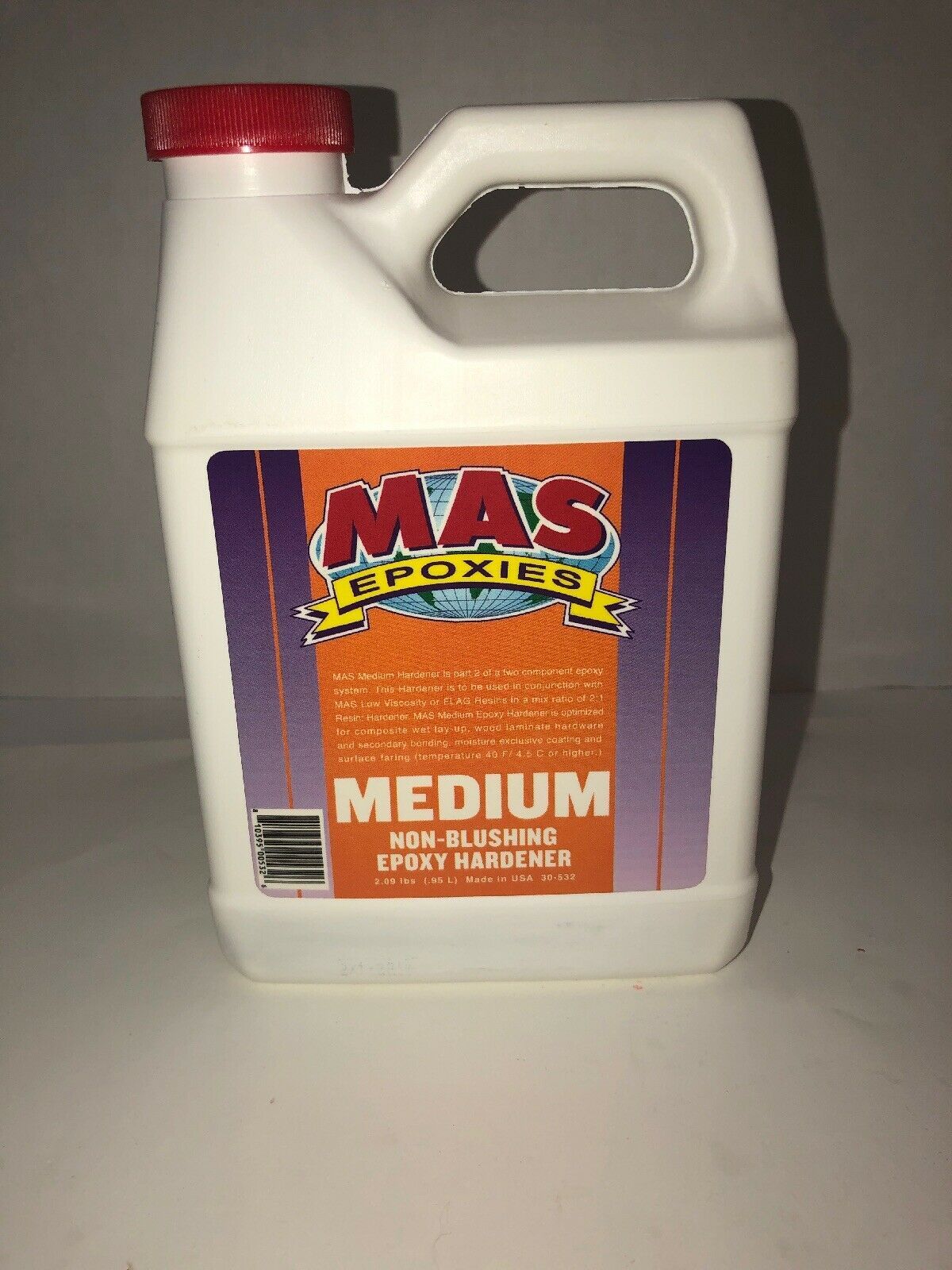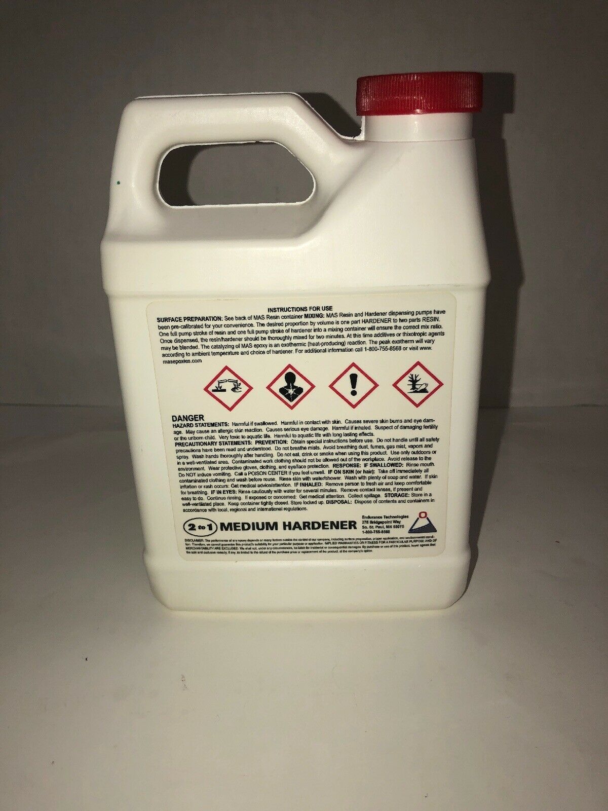32 Onces/1 Quart Large Bottle Mas Medium Epoxy Hardener by Endurance Technologies.Medium Epoxy Hardener. After mixing resin and medium hardener, you have 30 minutes to get it out of the cup and approximately 4 hours of open working at 70F. Good ultraviolet stability. Excellent barrier coating. Cures in high humidity. Recommended for large surface coatings and laminations. Blendable with fast hardener for customized working and curing times. Mix with appropriate MAS resins in a 2 parts resin to 1 part hardener ratio.