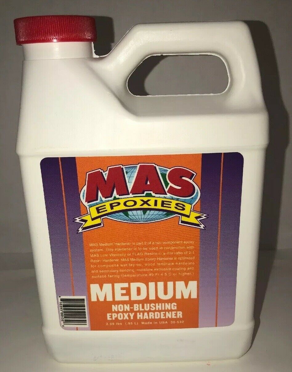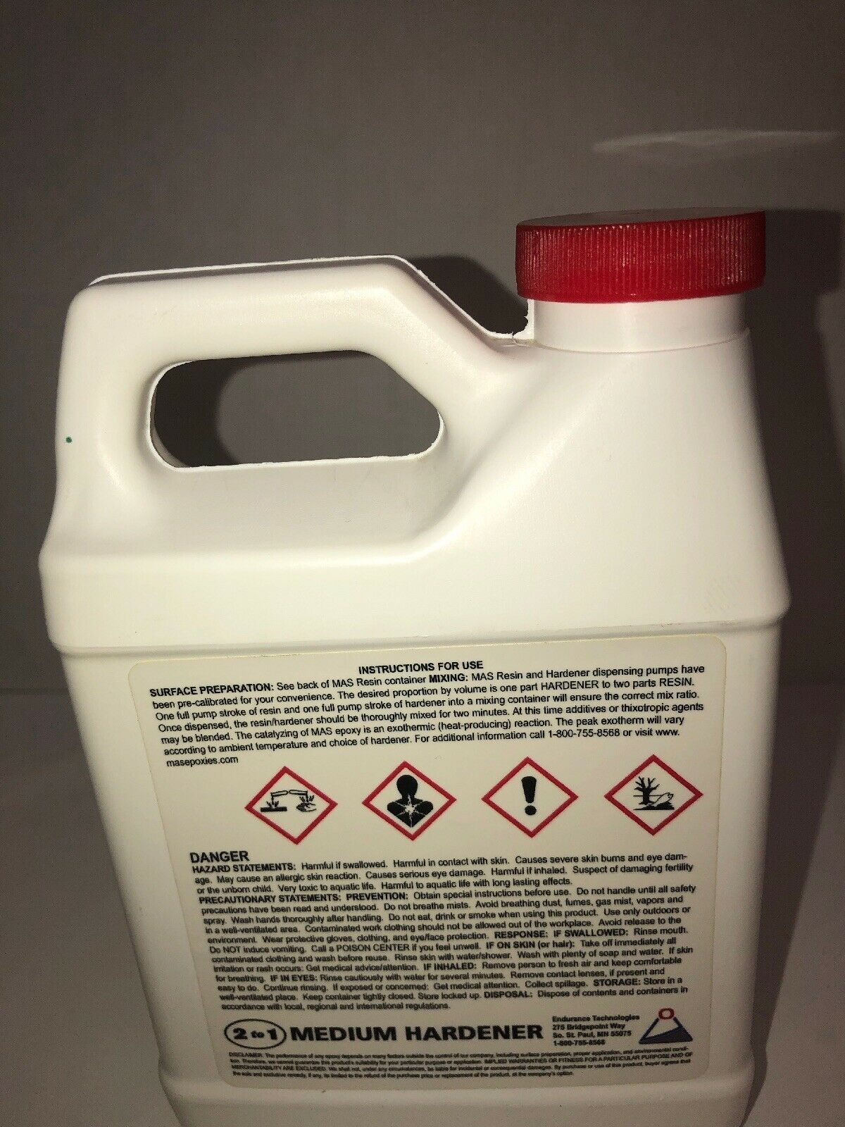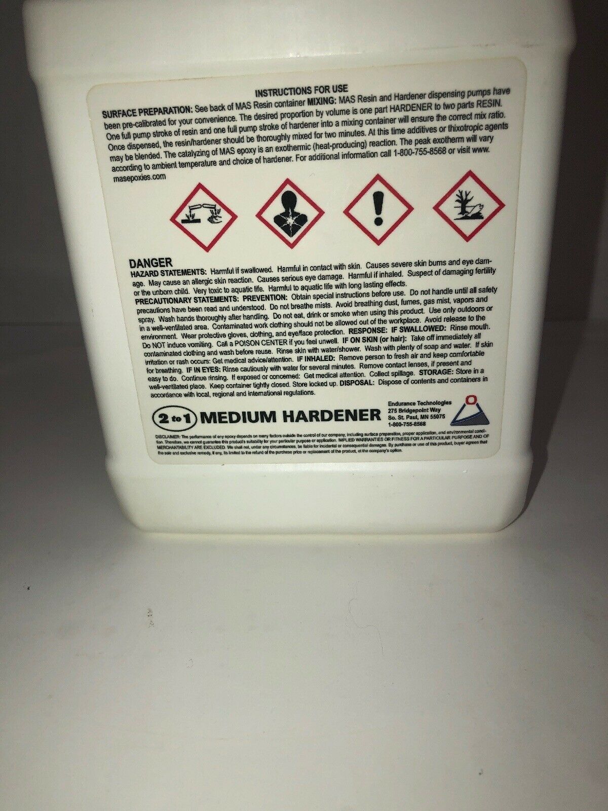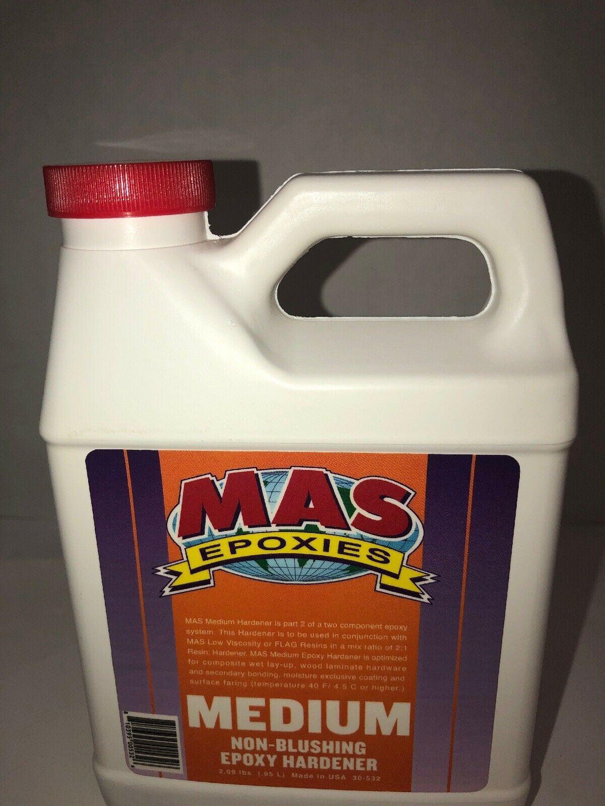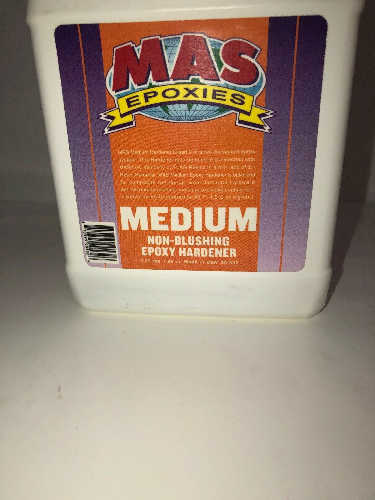 32 Onces/1 Quart Large Bottle Mas Medium Epoxy Hardener by Endurance Technologies.Medium Epoxy Hardener. After mixing resin and medium hardener, you have 30 minutes to get it out of the cup and approximately 4 hours of open working at 70F. Good ultraviolet stability. Excellent barrier coating. Cures in high humidity. Recommended for large surface coatings and laminations. Blendable with fast hardener for customized working and curing times. Mix with appropriate MAS resins in a 2 parts resin to 1 part hardener ratio.