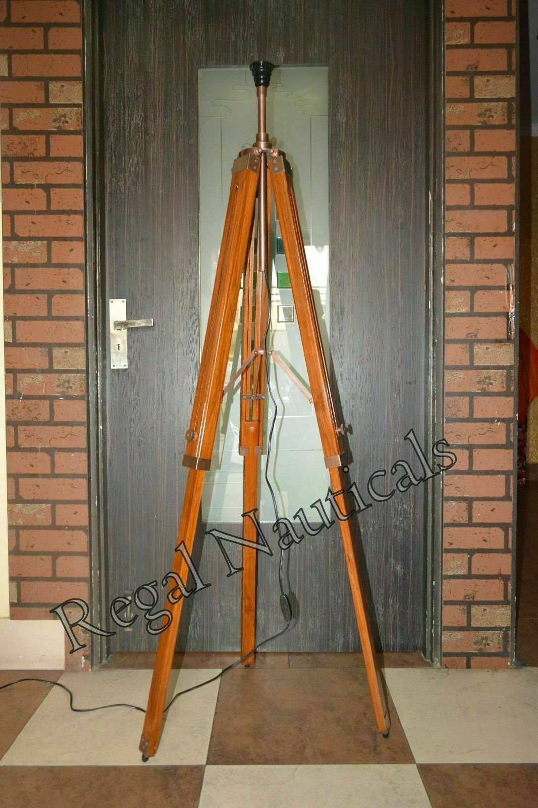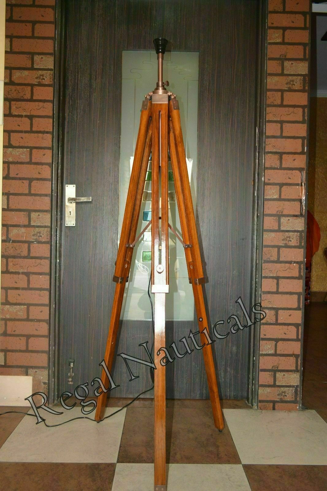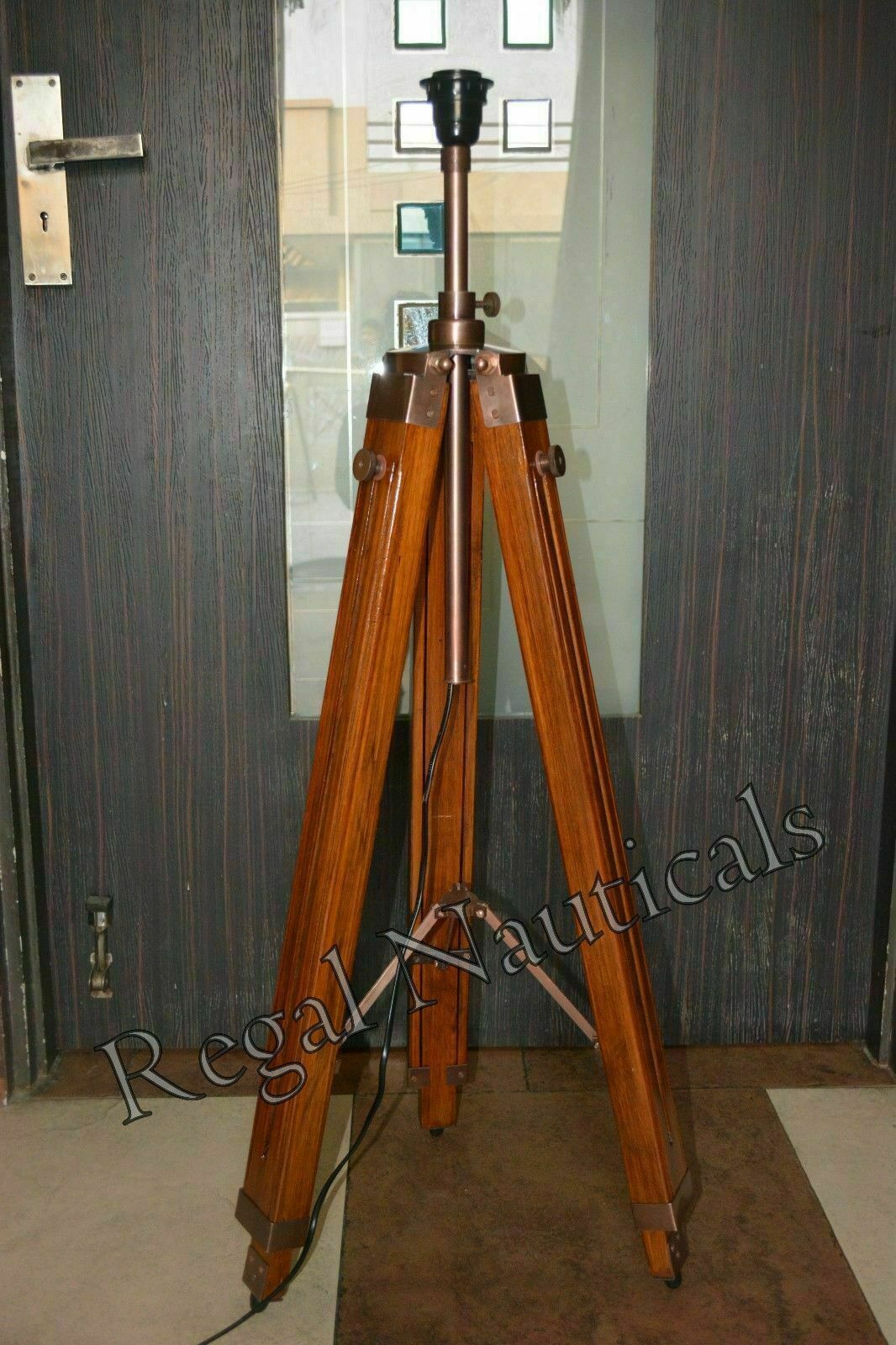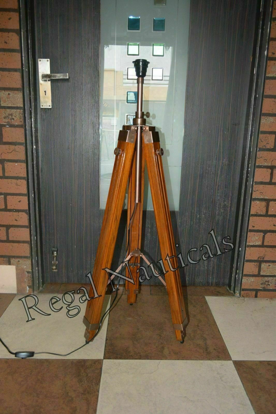 This beautiful floor lamp vintage model theme modern furniture lamp.These models have been made using original ship model specification.we have made this lamp using Aluminum and Brown Wood to Coper finish.It has beautiful wooden tripod Lamp. Royal search light modern nautical tripod vintage style nautical light.