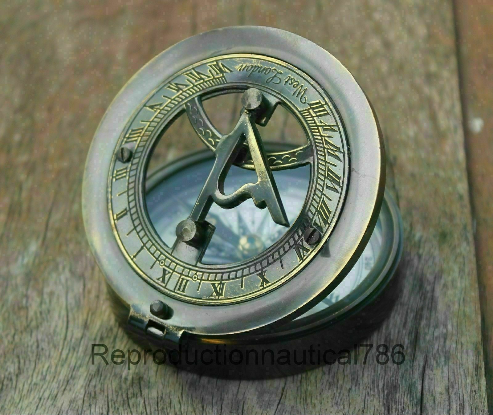THIS IS A BEAUTIFUL SOLID BRASS ANTIQUE REPRODUCTION OF A SUNDIAL COMPASS.