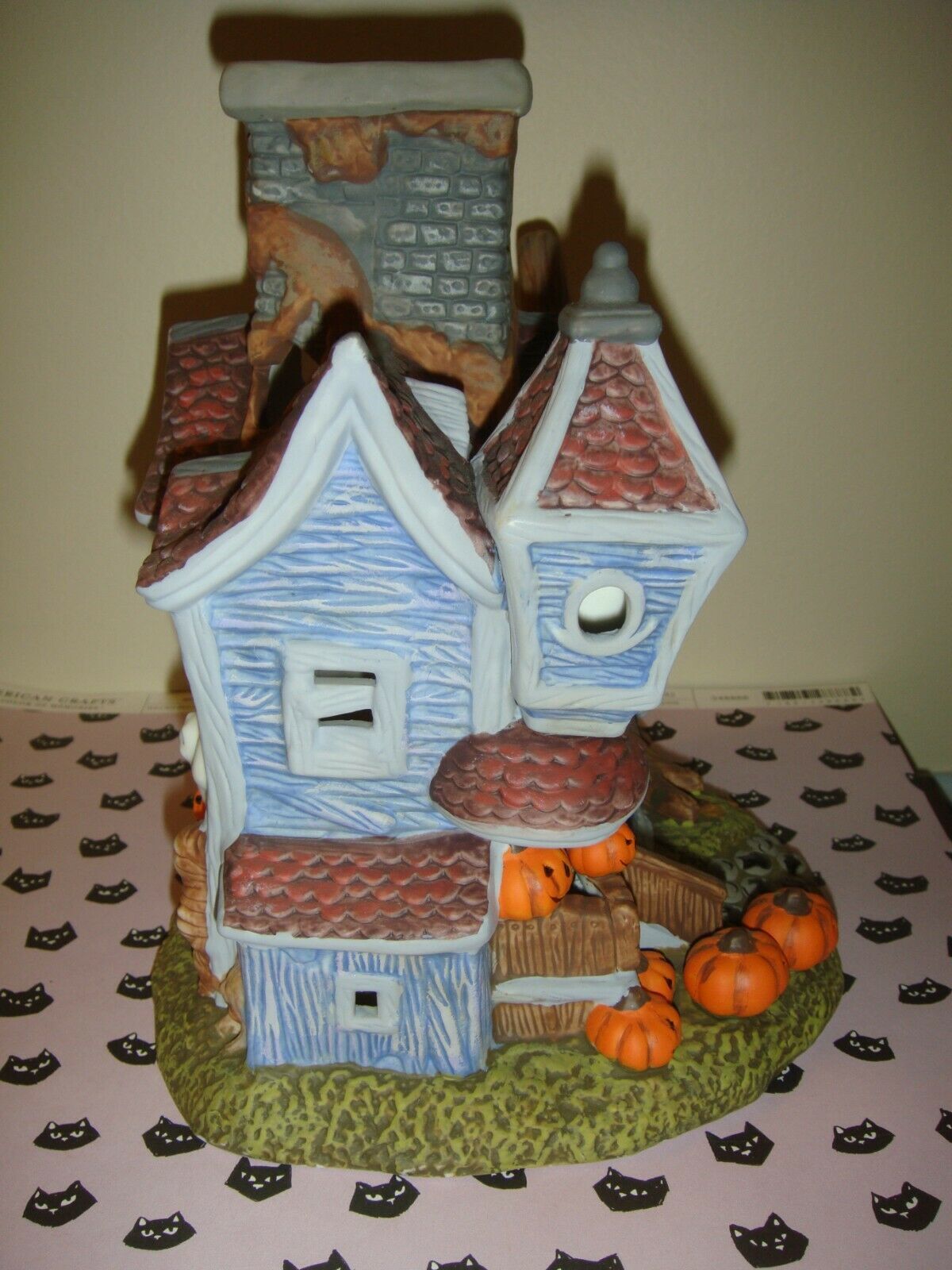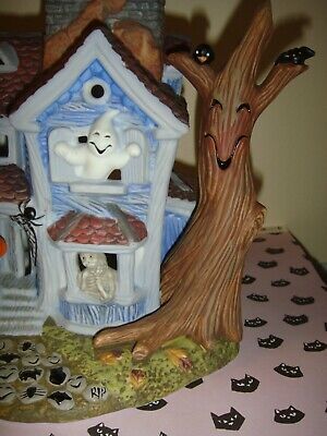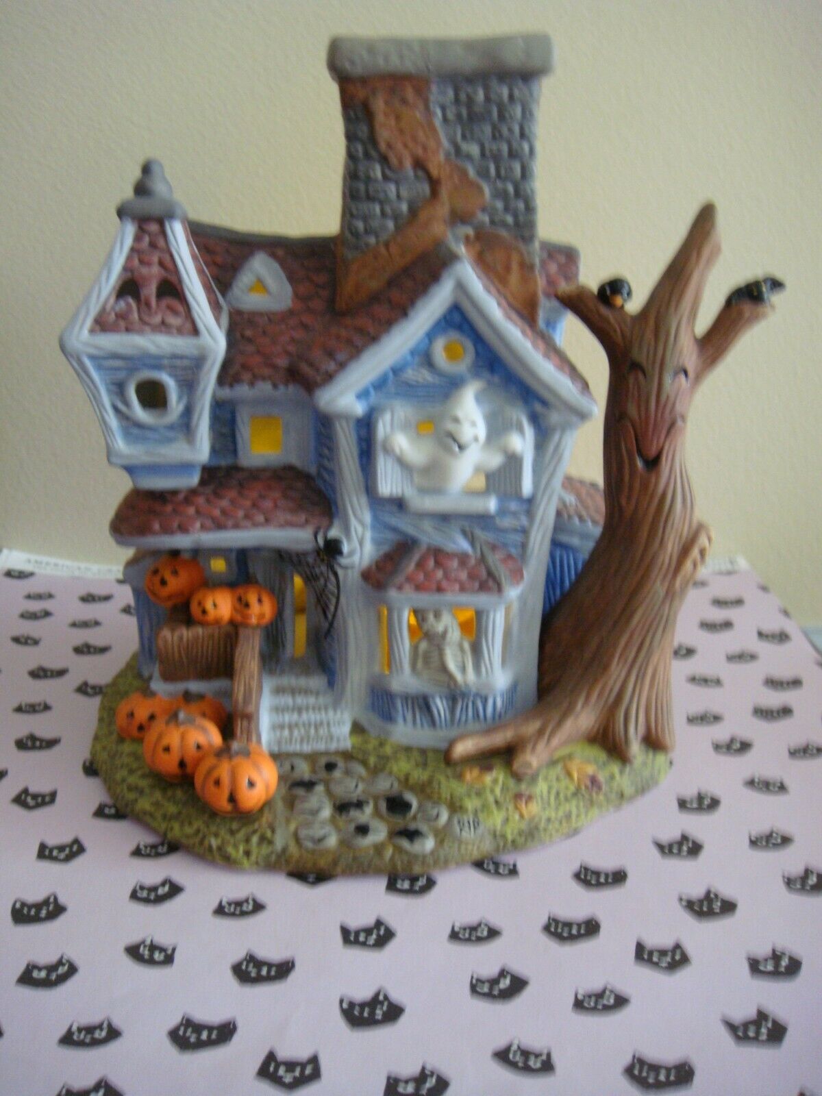 Has A Ghost Coming Out Front Upstairs Windows, Has Skelton In First Floor Window. Pumpkins By Front Door And Spider And Large Web. On Stones Going Up To Front Door Has Halloween Symbols Along With Smiley Faces. Next To House Is A Spooky Tree With Smiley Tree And Black Bat And Crow On Top Limbs. On Backside Of House Has Pumpkins Around Opening Where Tealight Goes In. Also Next To One Stack Ghost And Has Mummy. A Dog Has Has The Mummy Wrap In His Mouth. Has A Skelton Head On Ground On One Side. Has Cut Out Though Out House For Light To Shine Thru.