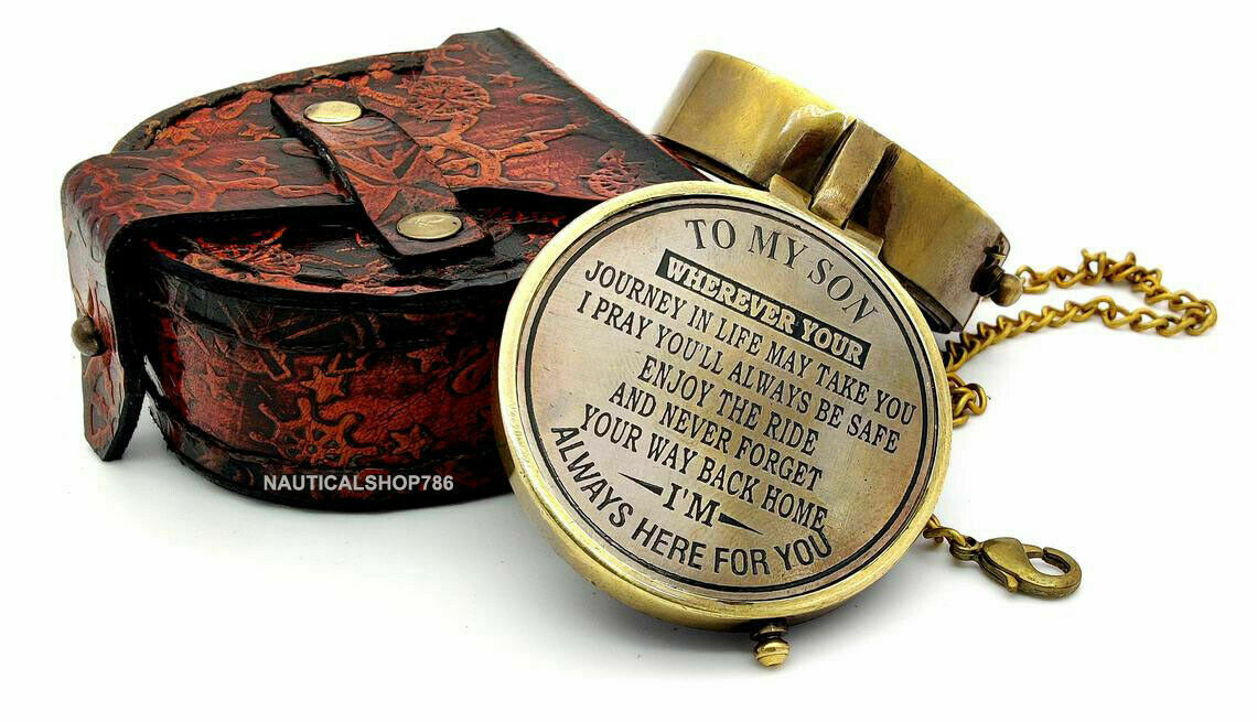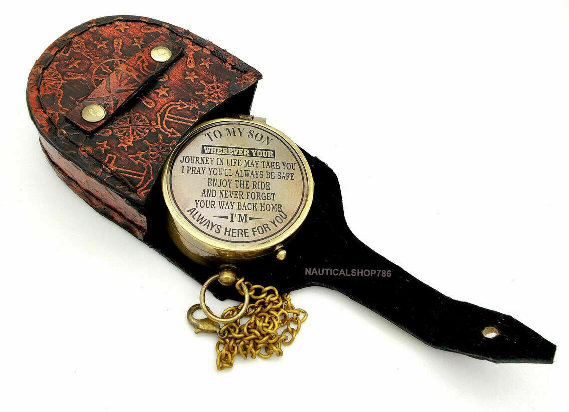 Unique Brass compass with leather case featuring the saying "To my son: wherever your journey in life may take you, I pray you’ll always be safe. Enjoy the ride and never forget your way back home.Son birthday gifts, son Christmas gifts, son memorial gifts, Valentines Day gifts for son, Fathers Day Gifts for son, novelty gifts for son, graduation gifts for son, wedding gifts for son, sons anniversary gifts.