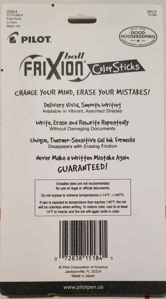Pilot Frixion Ball Color Sticks Black Gel Ink Erasable 4 Pens