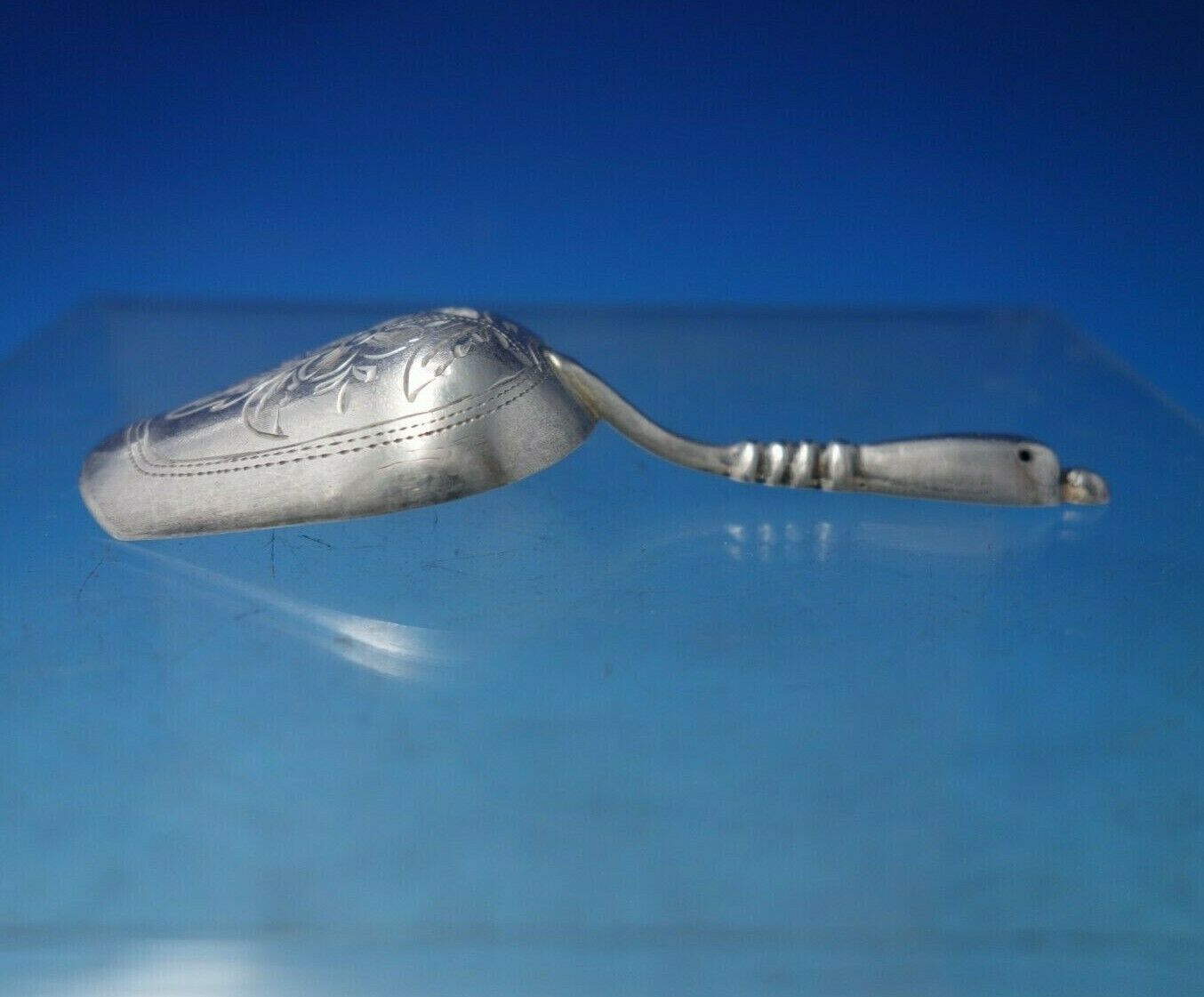 Beautiful Russian .84 silver tea caddy spoon / scoop with engraved flowers on the reverse (see photos; maker unknown). This piece measured 3 3/8". It is not monogrammed and is in excellent condition. Amazing!