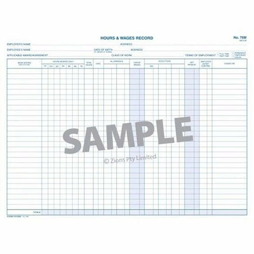 Suitable for up to 20 employees per year. Records weekly wages paid per employee giving week ending date, the hours worked daily, total hours worked, amount, allowances, total earnings, tax deductions, other deductions (2 columns), net payment and signature column.