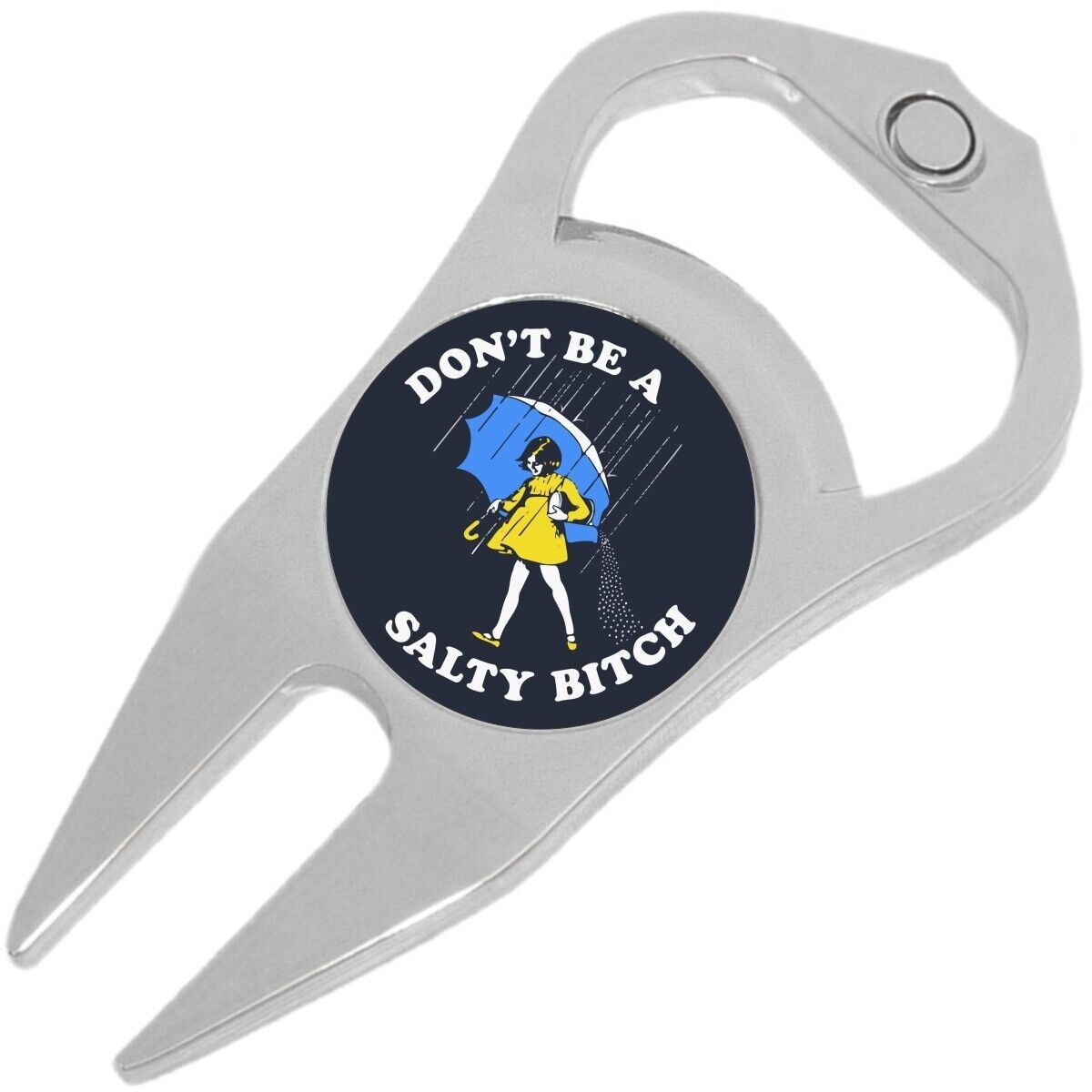Dont be a Salty Bitch Golf Ball Marker Divot Repair Tool Bottle Opener. This is an all-in one tool for the golf course. It features a ball marker with a high-quality unique image, a putting green repair tool, and a beer bottle opener. Included is a magnet to secure the ball marker to the tool. This item makes a great gift too!