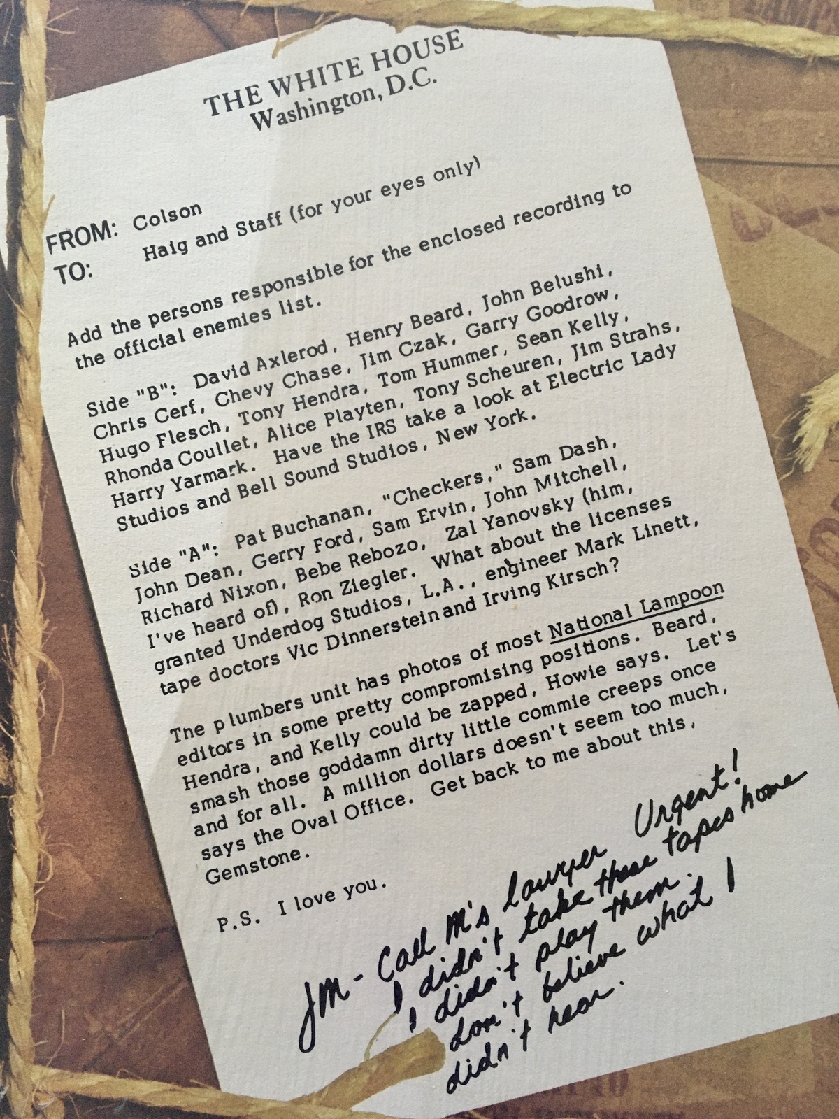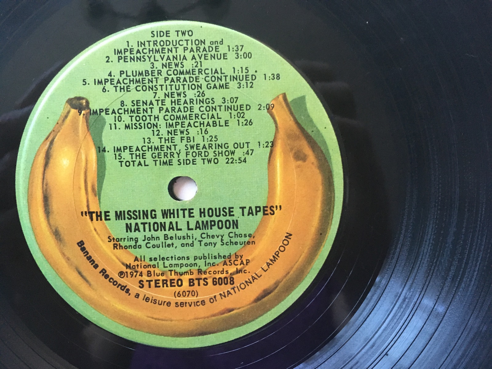 The Missing White House Tapes is a comedy album released as a satiric commentary on the Watergate scandal and is a spin-off from National Lampoon magazine. The recording was produced by Irving Kirsch and Vic Dinnerstein. It was released as a single on Blue Thumb Records in 1973. It was expanded into an album, which was subsequently nominated for a Grammy Award as Best Comedy Recording of the year.