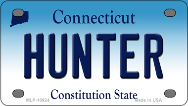 Hunter Connecticut Novelty Mini Metal License Plate Tag. 2.2" x 4" high gloss novelty mini metal license plate tag. Made of the highest quality aluminum for a weather resistant finish. It is lightweight and durable. Pre-drilled holes for quick and easy mounting on any vehicle, or add a ribbon, wire or string to instantly turn this license plate into a sign and display it on a wall or door. Individually shrink-wrapped and proudly made in the USA.