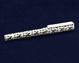 This autism ribbon ball point pen is 5 1/4 inches long and has an autism ribbon design. This pen writes in black.