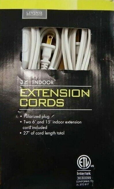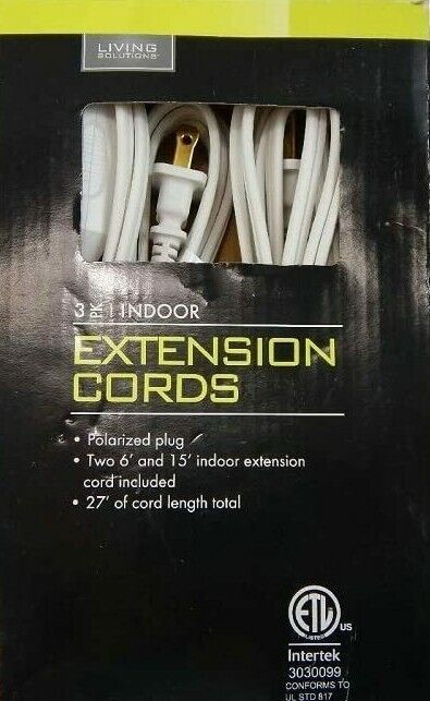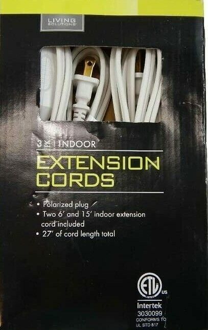 You are Buying a Brand New And factory Sealed Living Solutions 3 Pk Indoor White Extension Cords Two 6 ft + One 15 ft cord with Polarized Plugs.