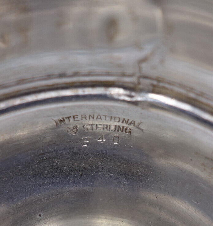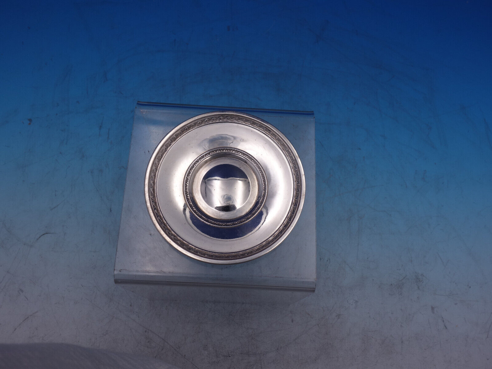 It measures 4" in diameter x 2 1/2" tall (with liner) and weighs 3.68 troy ounces (without liner). It is not monogrammed and is in good vintage condition. Lovely!