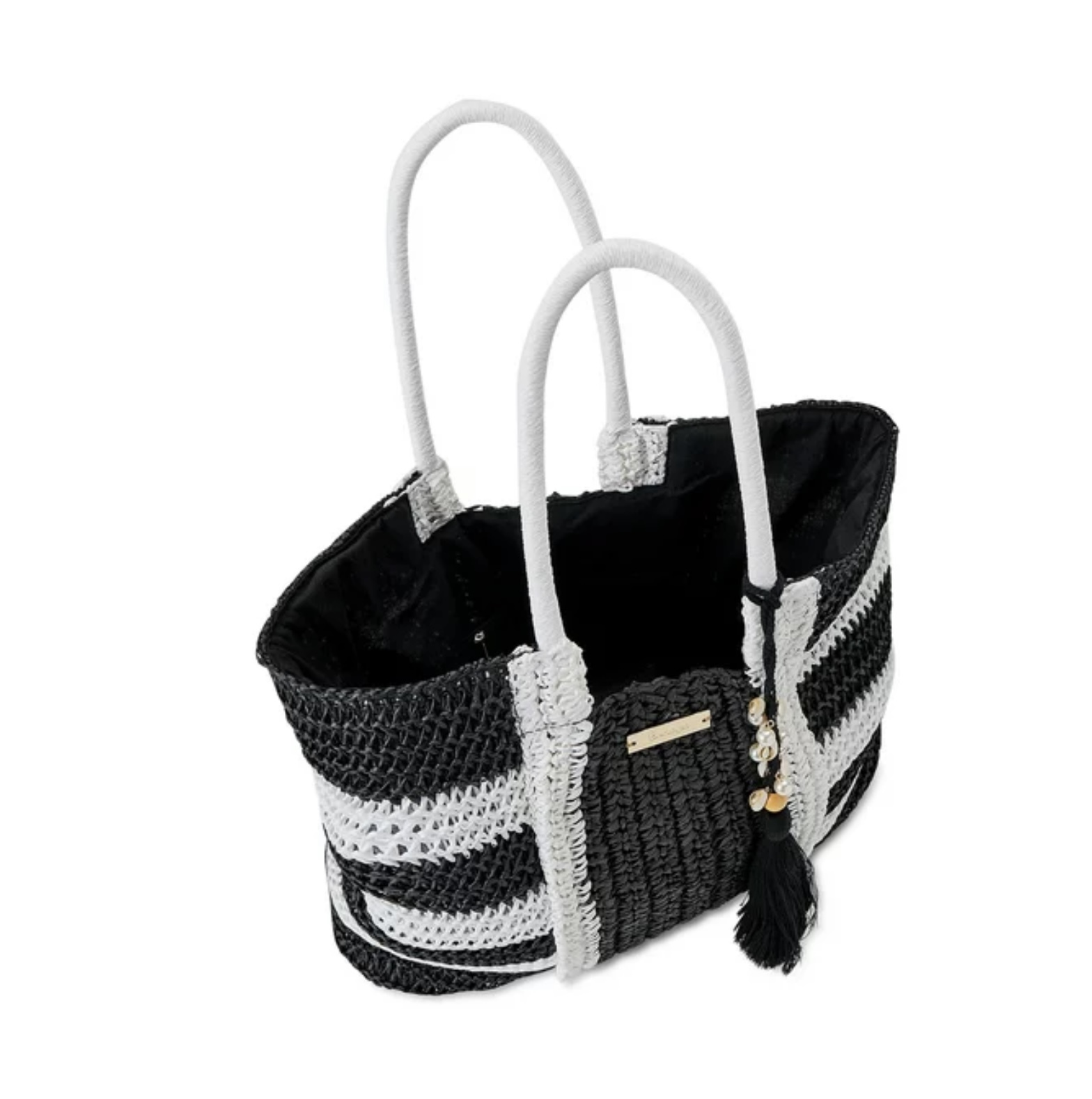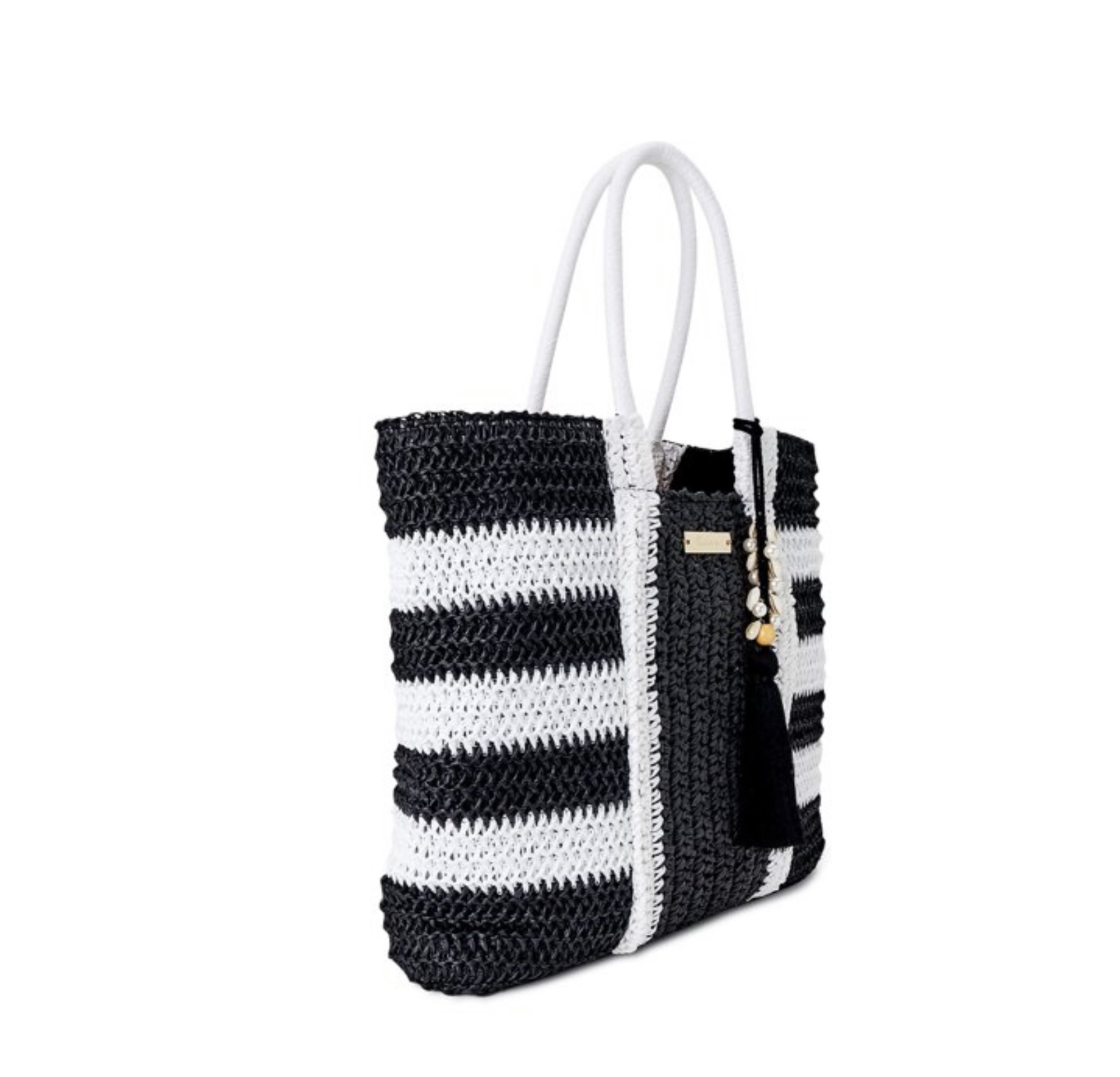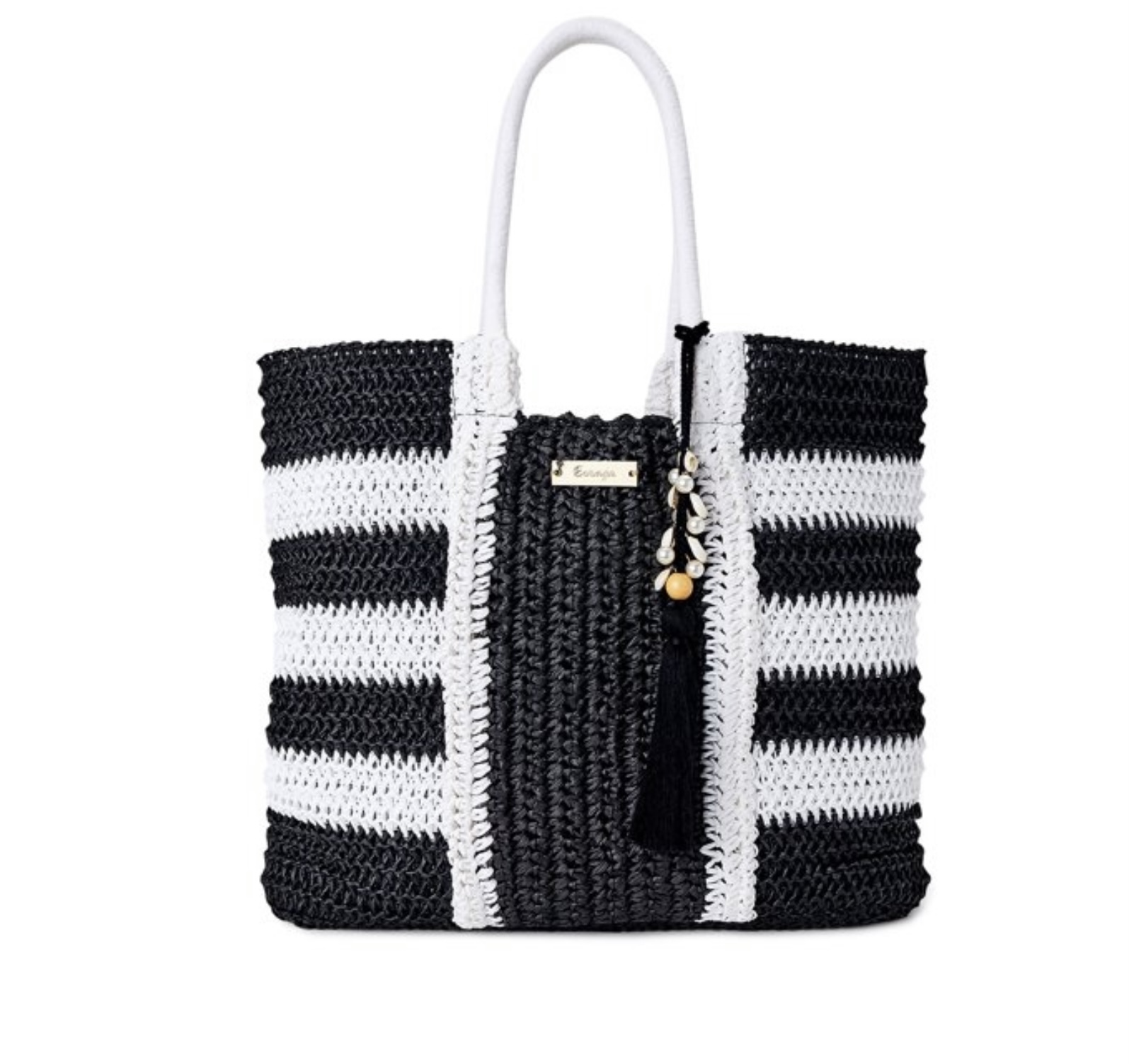Exterior details: Woven straw in stripes; tassel detail with faux pearls, shells and beads