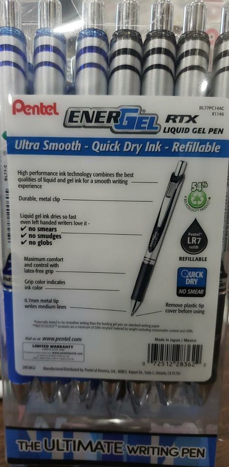 The EnerGel RTX retractable gel pens offer a luxury feel and a smooth, effortless writing experience. High-performance ink technology combines the best qualities of liquid and gel ink. Fast-drying liquid gel ink is great for left-handers: no smears, no smudges, no globs. The sleek and stylish barrel design features stainless steel accents for a professional look. The latex-free grip provides extended comfort and control when writing. The 0.7mm stainless steel tip writes medium lines.