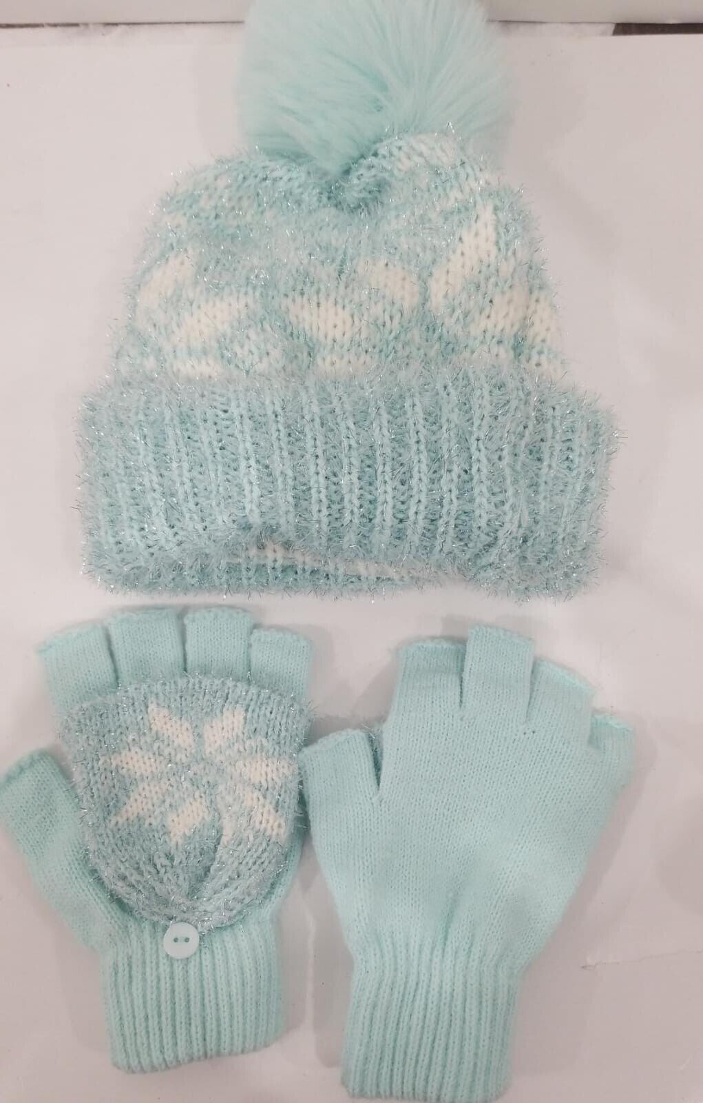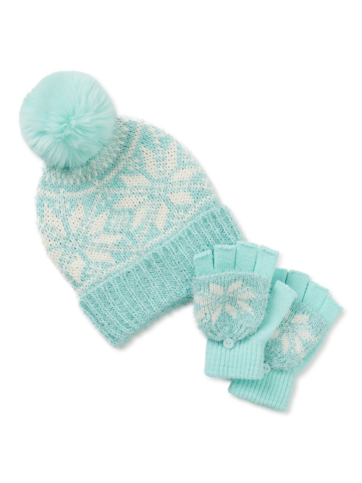 Holiday Time Women s Tinsel Snowflake Hat and Gloves 2-Piece Set, Green One Size