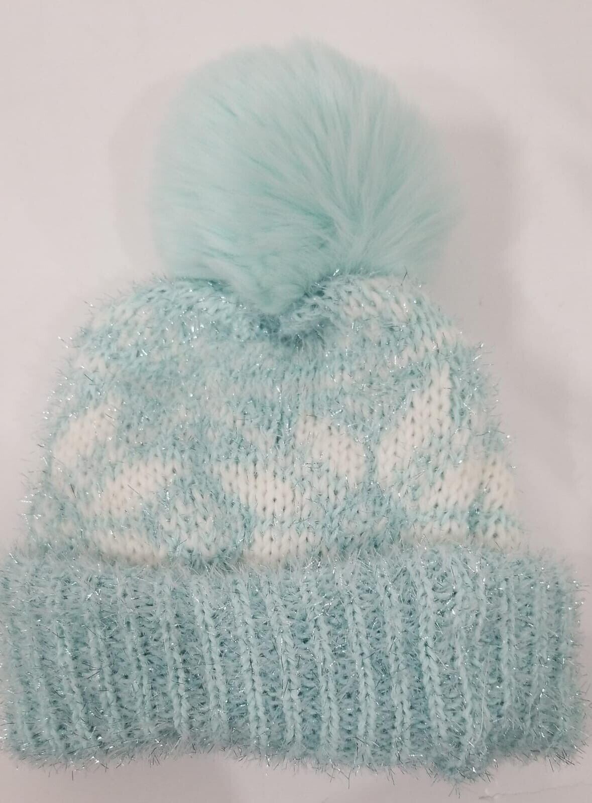 Hat features: Pull-on style; one size fits most; ribbed opening; pom-pom on top; snowflake pattern