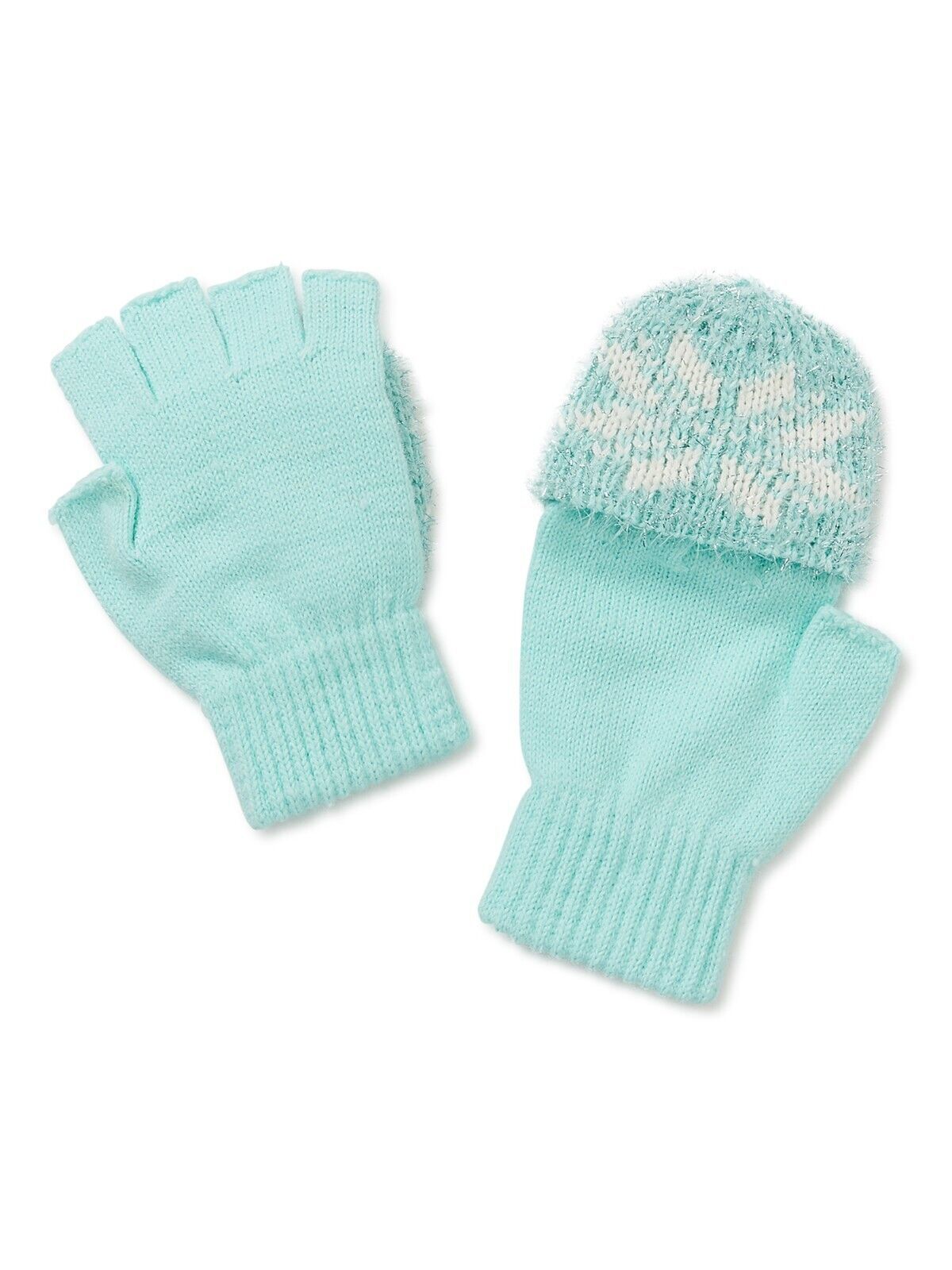 Gloves features: Pull-on styling; fingerless design with flip mitten top; ribbed cuff; snowflake pattern
