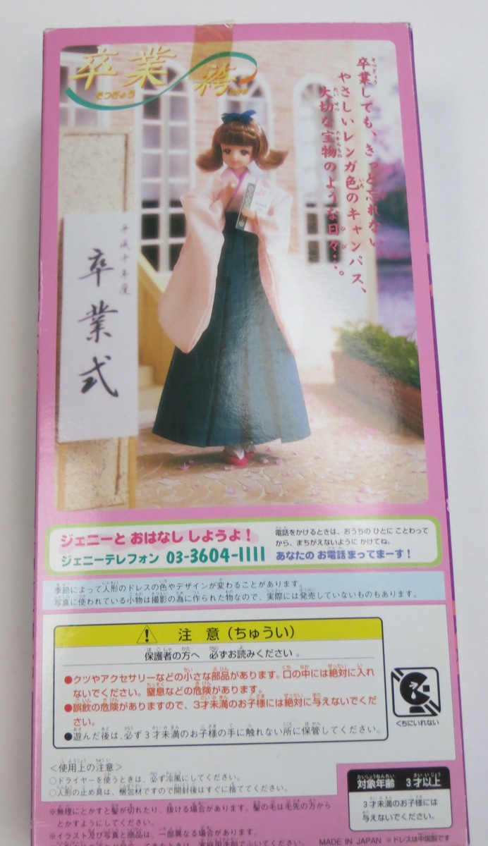 NRFB Takara Jenny-Chan Graduation Hakama Kimono doll from Japan. The box is dated 1981. The plastic cellophane window on the front is loose at the top and separating from inside the box. The doll does not appear to have any dust inside from the loose plastic. A book accessory inside the box has come loose from the back cardboard liner so is hanging by only one piece of tape (not shown in photos). The doll has some loose hair strands. Box has some minor wear.