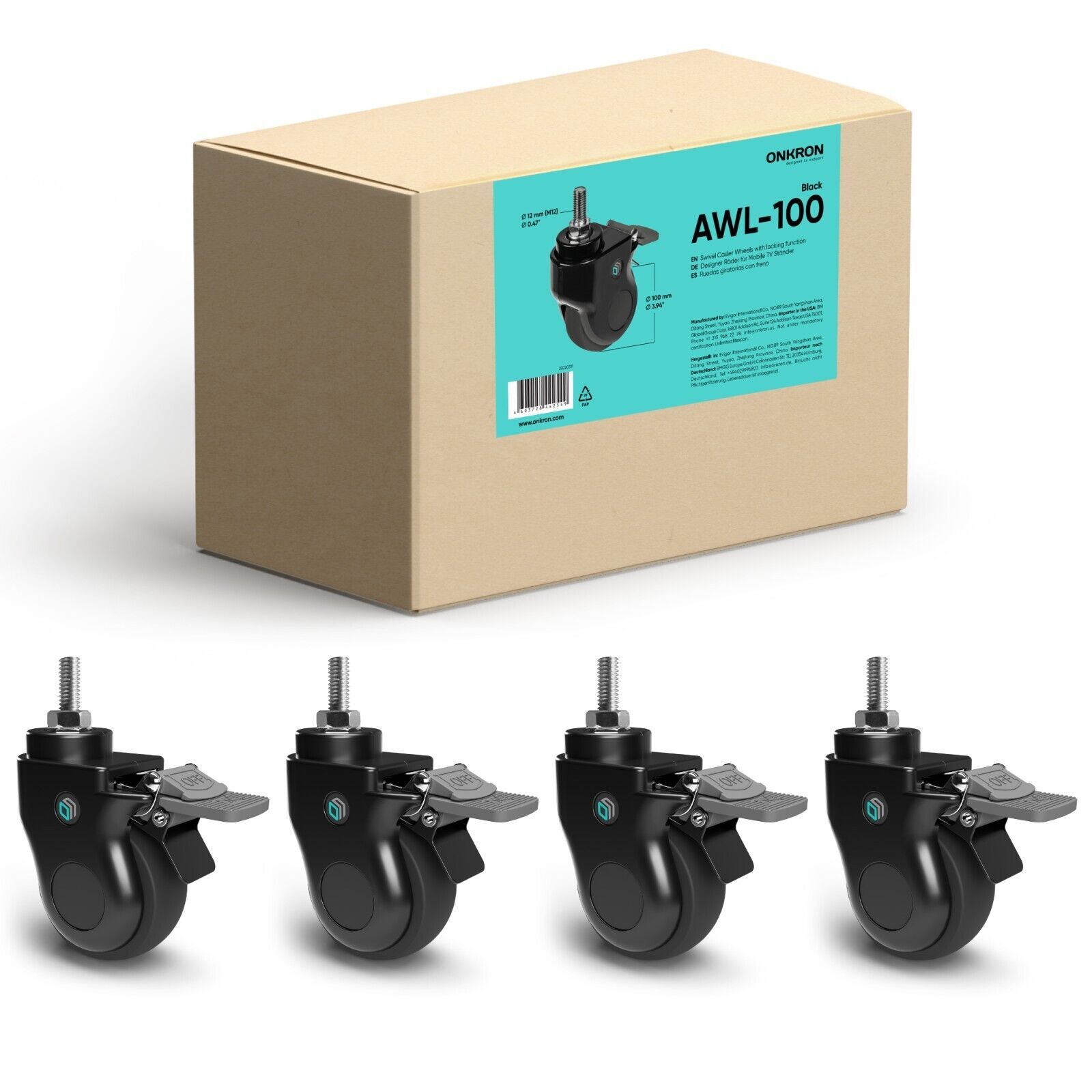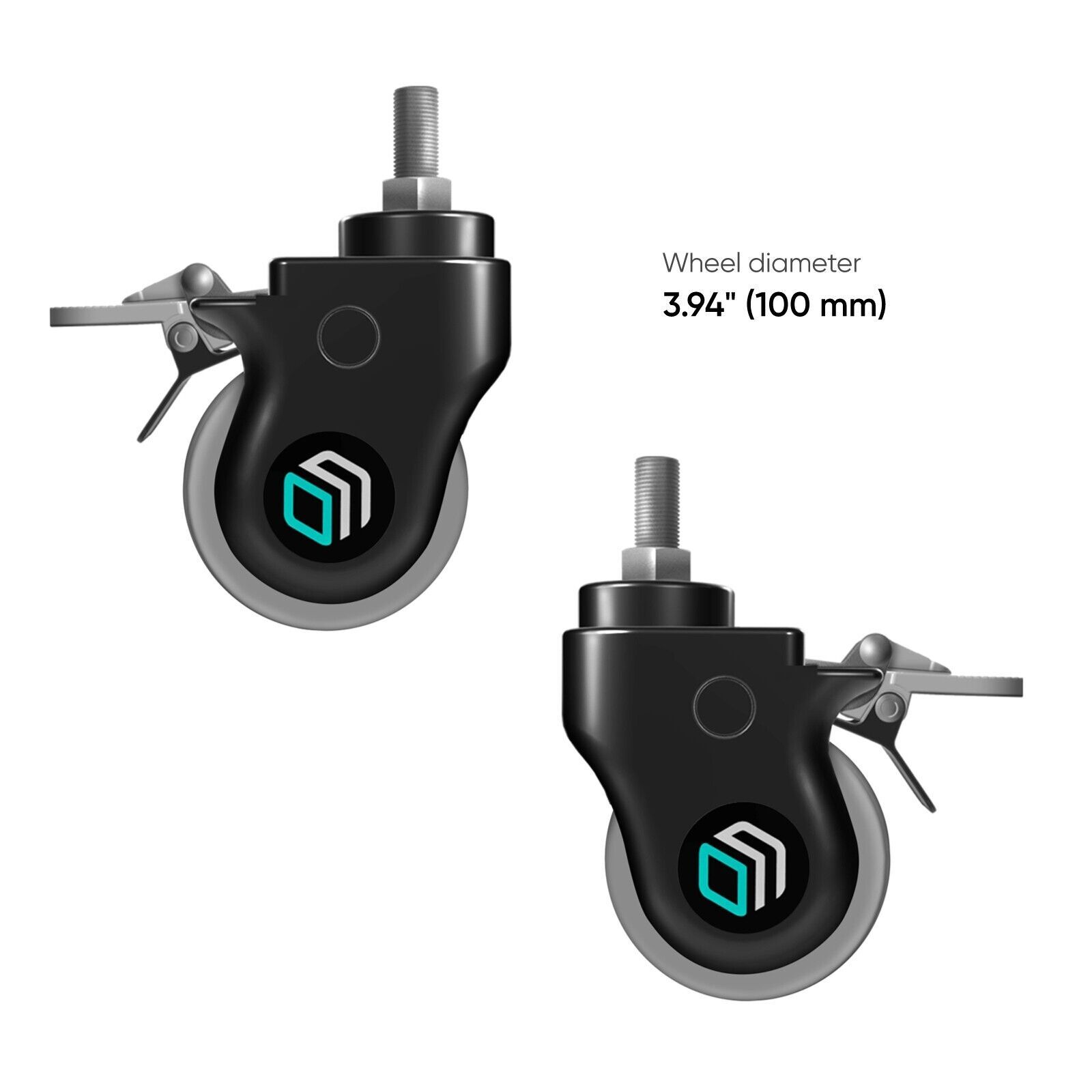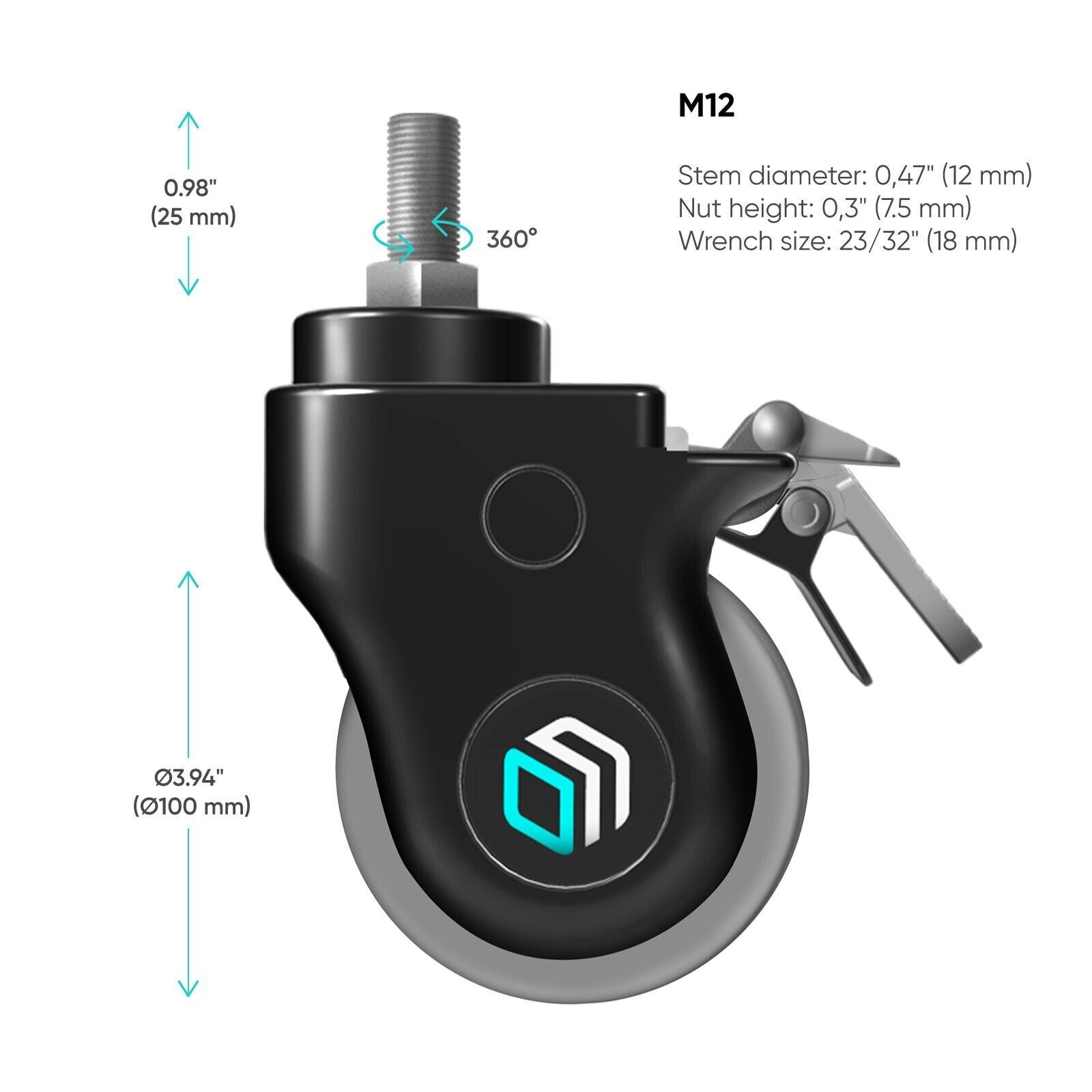 Multipurpose 3.95-inch size of the wheels with a 0.47” (M12) threaded stem can be attached to any desk, cart or a mobile TV stand; these locking caster wheels can be a perfect replacement for standard wheels of TV carts by ONKRON, including models TS1551, TS1881, TS2771 and many others