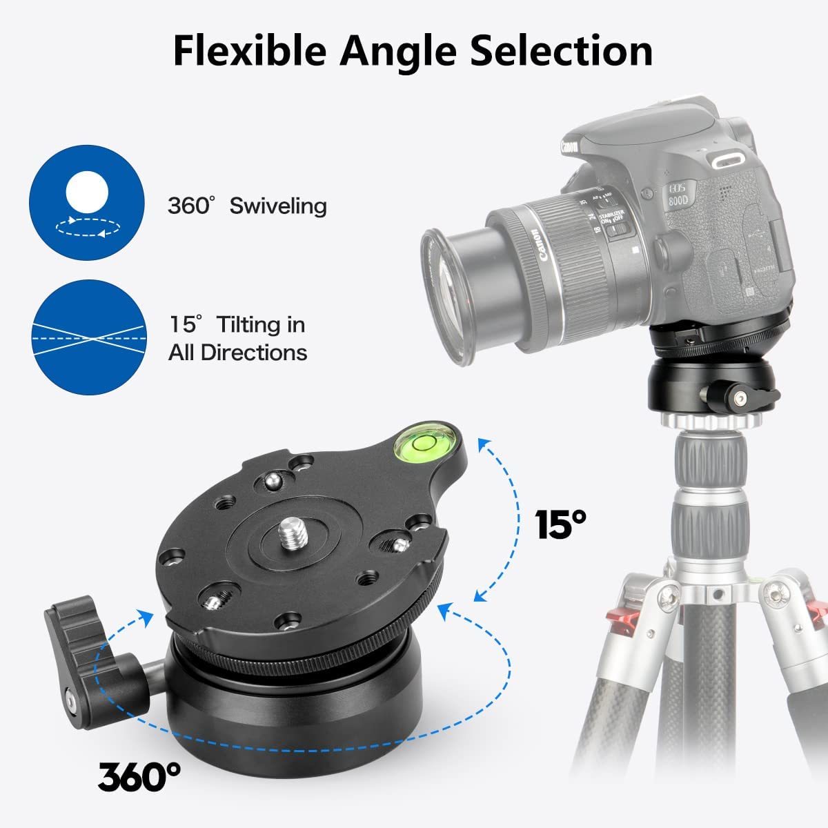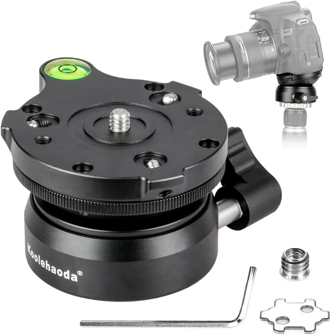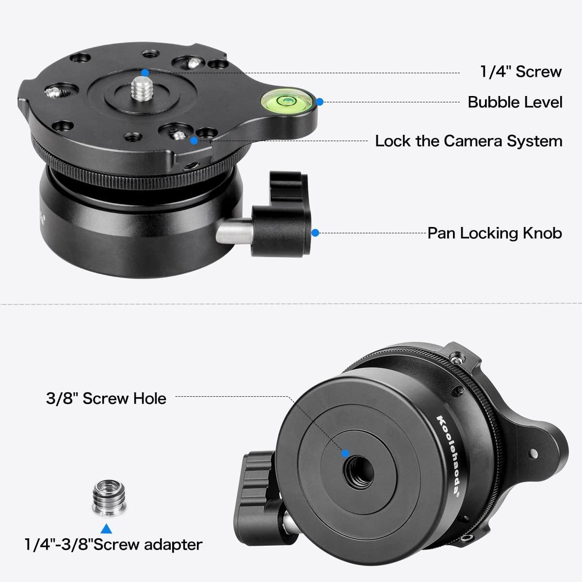 All-metal material, CNC precision machining, surface anode anti-oxidation treatment, stable and durable. Adjustment range from: +/-15 Top 1/4" screw can be installed with most photographic cameras. Bottom diameter 60mm and 3/8" thread hole is applicable with most tripods,comes with a 3/8" to 1/4" screw adapter. The Leveling Head is practically maintenance free and it can be moved very easily.Built-in Bubble Level. Use a hexagonal wrench to adjust the 3 movable screws to prevents tripod head from moving.