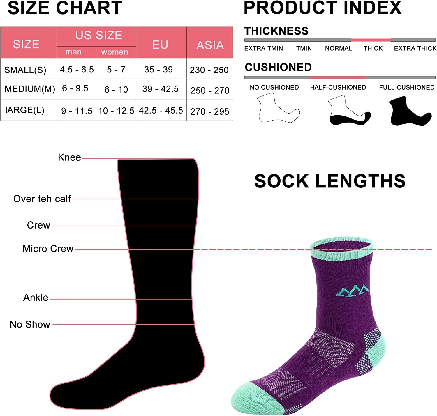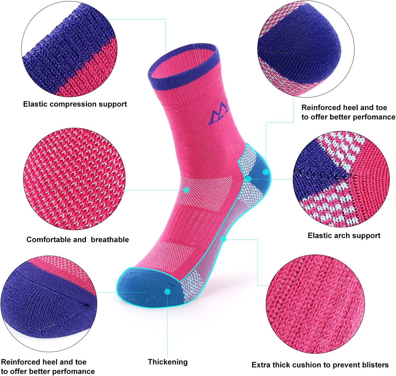 Merino Wool,Polyester,Spandex ?MATERIAL?72% merino wool, 13.5% spandex, 9.5% elastane, 5% nylon. Featured with impact cushioning and ventilation zones, and keep your feet warm in cold weather and stay fresh and dry in any weather. SIZE: M (Women: 6.5-10 US Size). Each pair socks weight 0.12lb/53.7g. ?DURABLE WOOL HIKING SOCKS?Full thickness and cushion along the bottom of the foot can gently support and protect your arch, ankle, heels and stay up-compressed top holds the boot socks securely on the calf, as well as the highest quality merino wool socks keep your feet warm and dry during trekking. ?WELL PERFORMANCE? Ideal for hiking, trekking, walking, rock climbing, camping, mountaineering and other athletic outdoor activities and wide variety of summer and winter sports, performance fit assures there's no slipping and no blisters. ?COMFORTABLE TO WEAR?Fine gauge knitting and supper soft fuzzy inner provides compression, arch support and reinforced heel and toe to ensure maximum comfort and protection, also for increased durability and life of the socks. ?100% COMPLETE SATISFACTION?3 pairs micro crew womens hiking socks in one set. Great durability and great for gift idea, buy with confidence. Machine or hand wash inside out in cold or warm water, and then air drying is recommended. If you have any questions about this product, do not hesitate to contact us.
