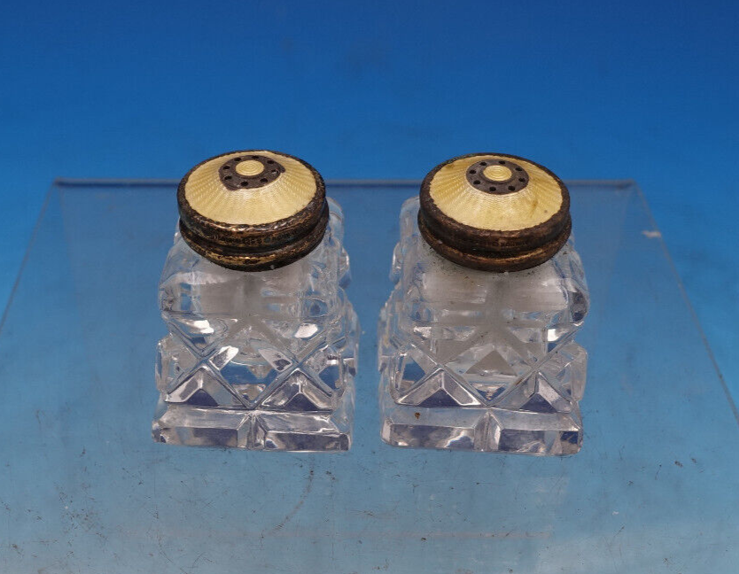 glass salt and pepper shaker pair featuring yellowenamel on sterling silver tops (maker unknown). These shakers measure 1 3/4". They