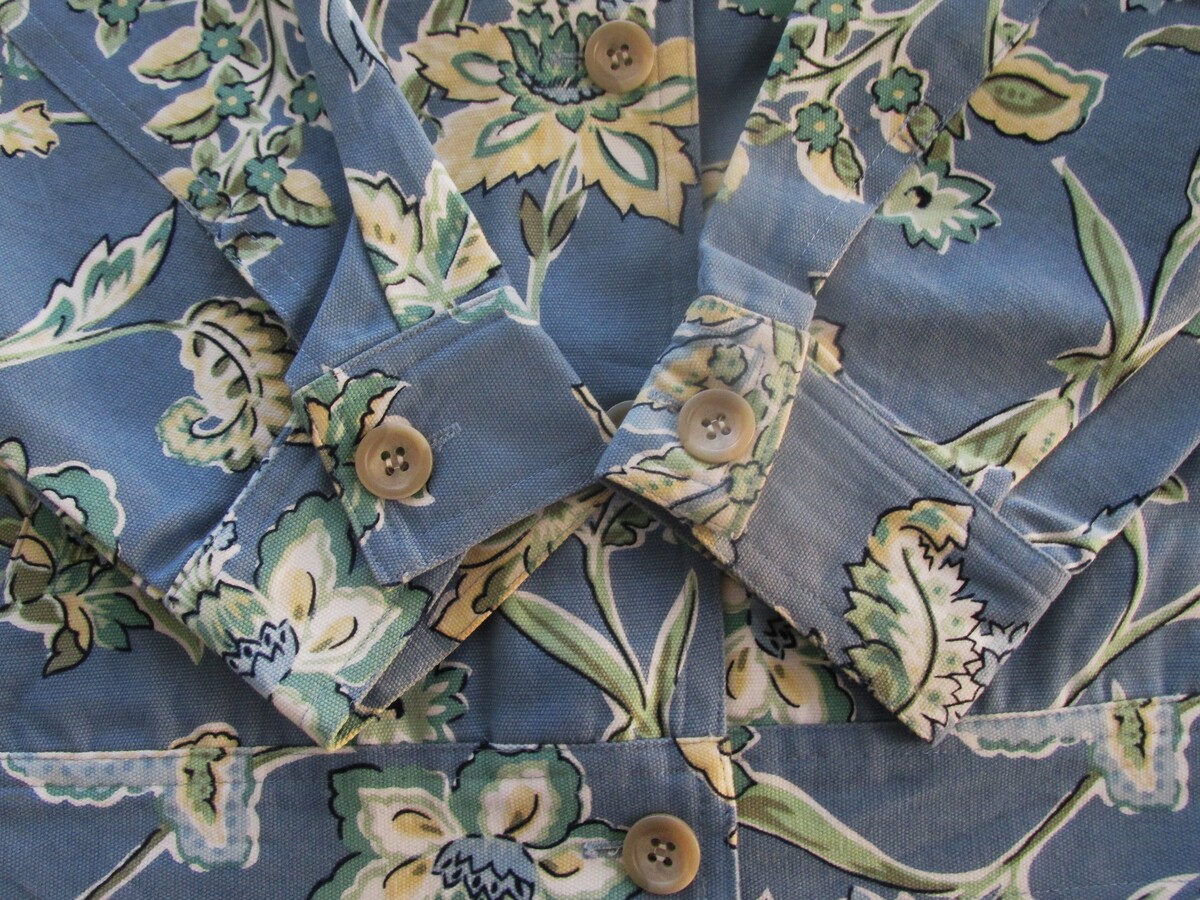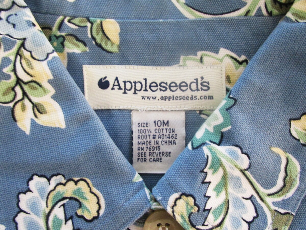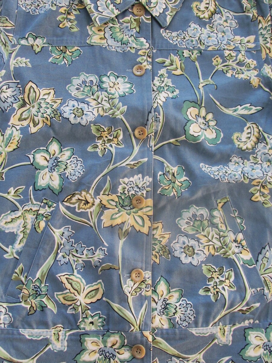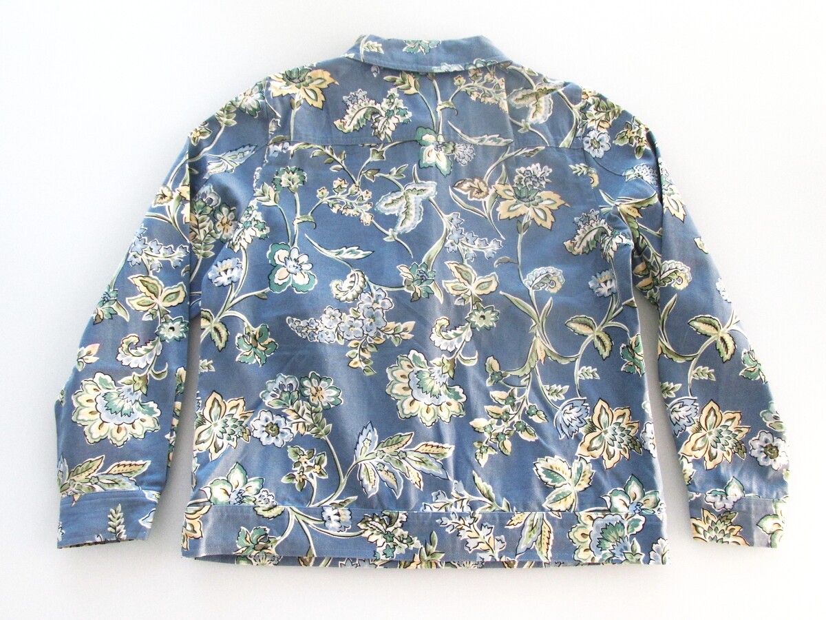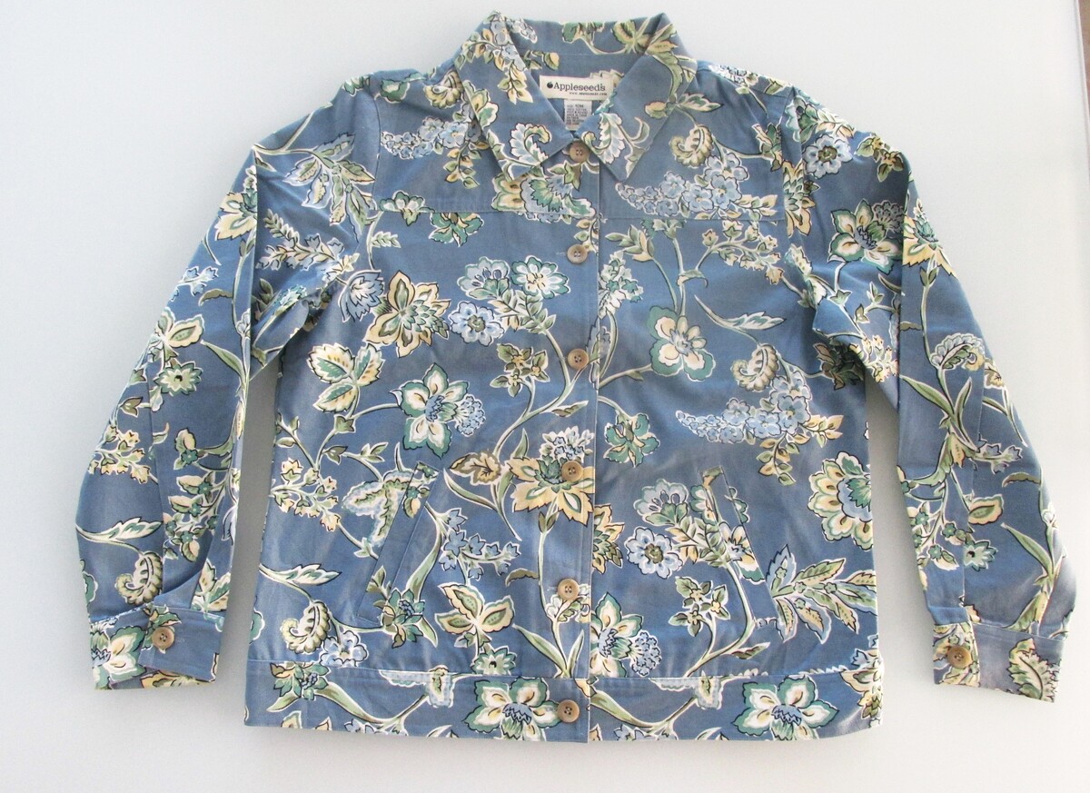 Description: Up for sale is an Appleseed's (NWOT) women's denim-styled jacket. This jacket is size 10M. It is made of 100% cotton fabric. It has a multicolored floral pattern in green, yellow, blue, black white on a medium blue background. It has a full button front and cuffs with 2 side slash pockets.