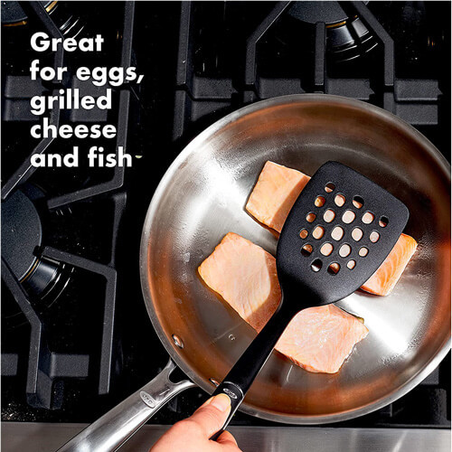 You''ll be reaching for the OXO Good Grips Nylon Square Turner every day in the kitchen. The turner is made of heat resistant nylon that will hold up against temperatures up to 205 degrees Celsius. The OXO Good Grips Nylon Square Turner is also safe for use on all pans, not leaving behind scuffs and scratches. Use for everything from eggs to meat. Along with other products from the range, the OXO Good Grips Nylon Square Turner creates a perfectly functioning kitchen.