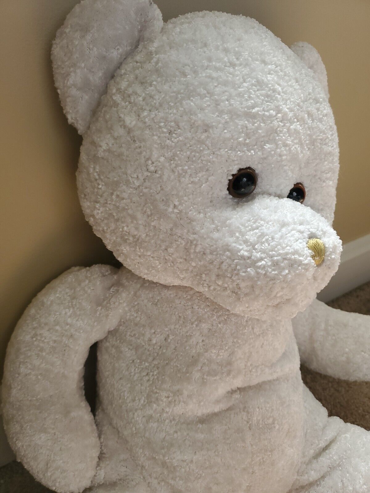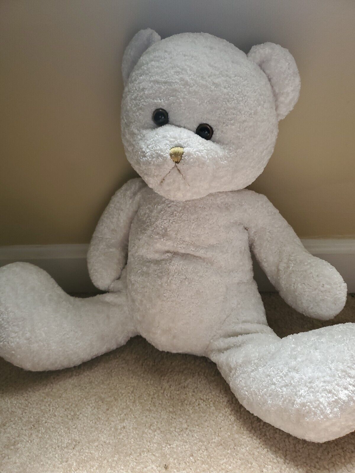 This vintage snuggle toy white teddy bear is the perfect addition to any stuffed animal collection. With its soft and cuddly exterior, this snuggle toy is sure to provide comfort to anyone who hugs it close. Measuring in at a 20 inches, it is the perfect size for a child to snuggle with or for an adult to display on a shelf. This bear is a must-have for any fan of vintage stuffed animals.