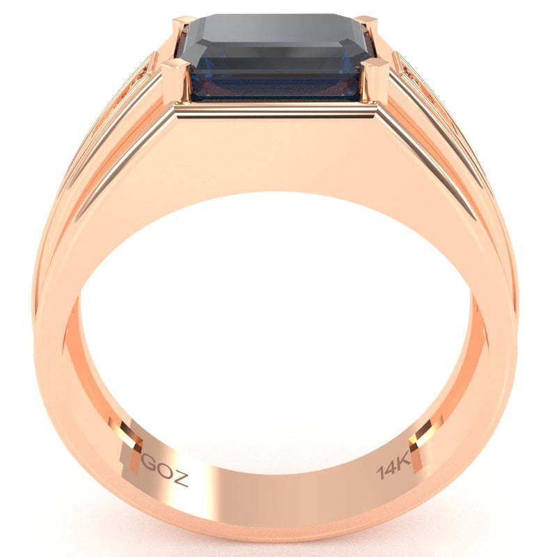Classic and bold men's lab-created sapphire and diamond ring crafted in solid 14k rose gold. With a twelve diamond channel set and a 6x8mm emerald cut center stone set horizontally, this one is guaranteed to impress.