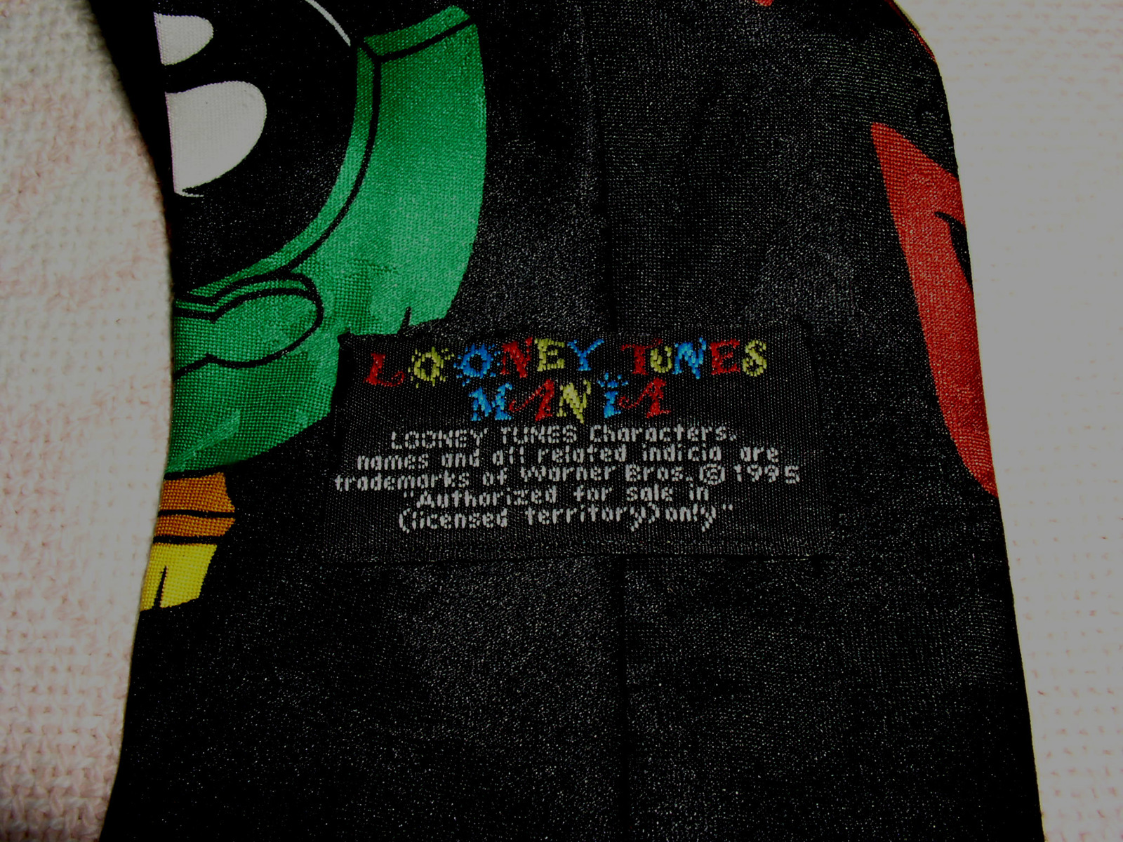 Looney Tunes dated 1995 - Bugs Bunny, Daffy Duck, Tasmanian Devil: Black - 3 1/2" wide, 60 1/2" long. Fabric is 100% polyester. Note: The thin end has some back thread pulls but not visible from the front.