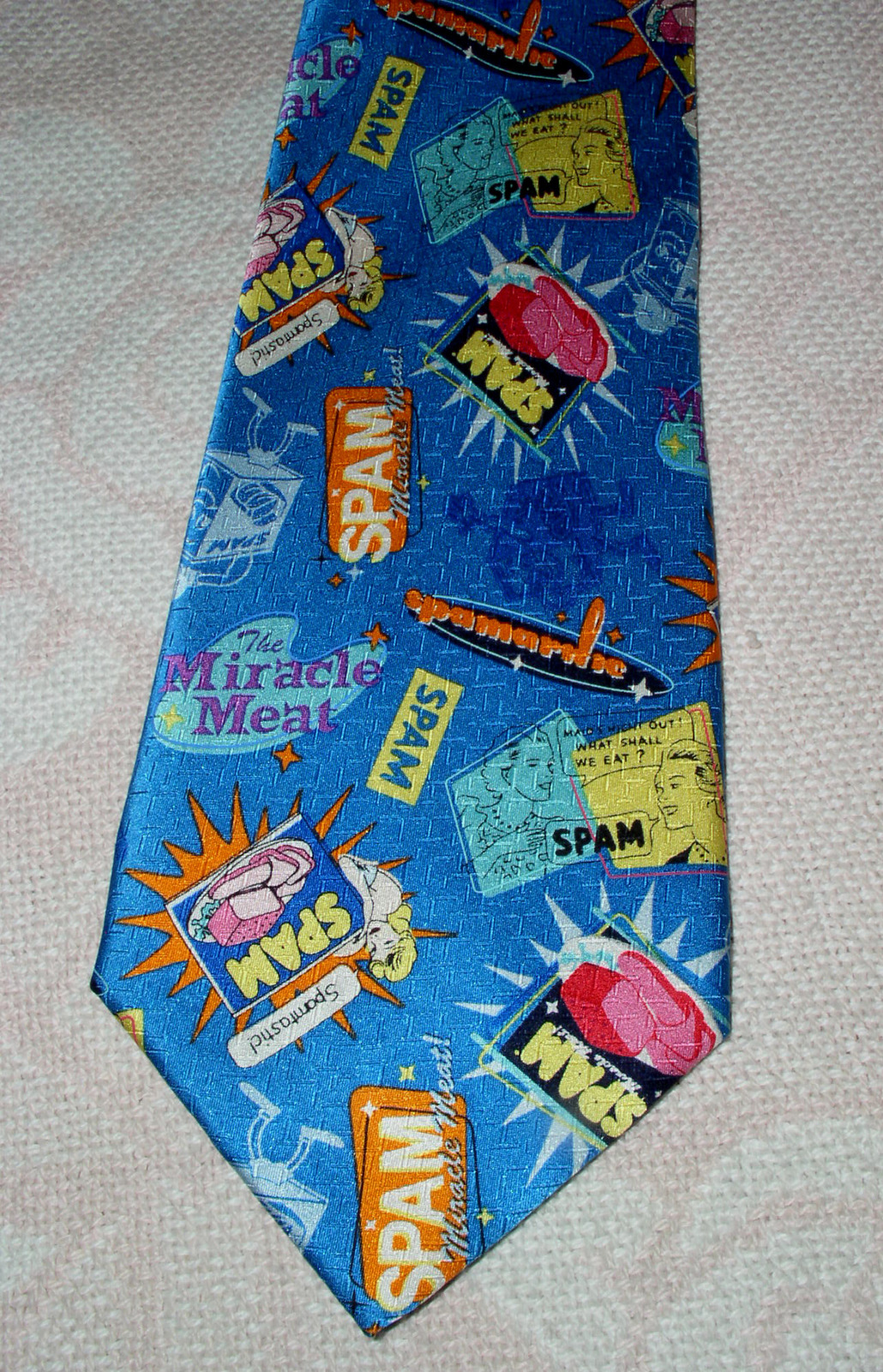 Spam Hormel Foods: Blue - 3 3/4" wide, 59" long. Fabric is 100% silk.