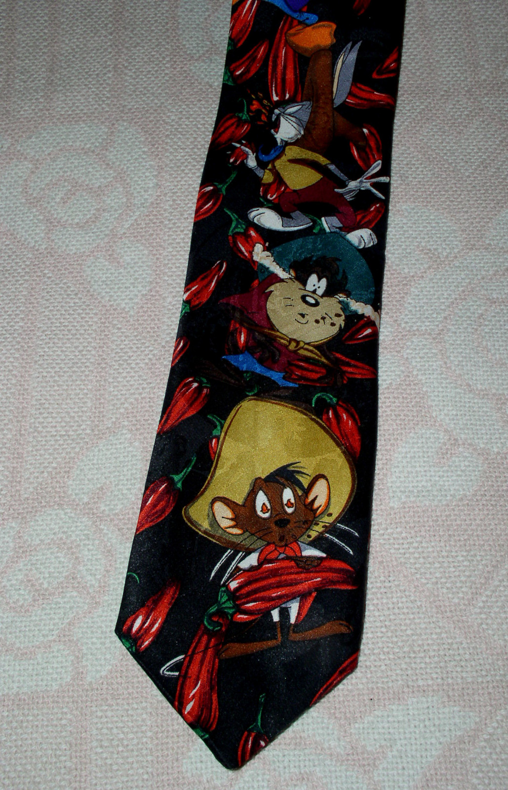 Looney Tunes dated 1994 - Tasmanian Devil, Bugs Bunny, Daffy Duck, Speedy Gonzalez: Black - 3 1/2" wide, 57" long. Fabric is 100% polyester.