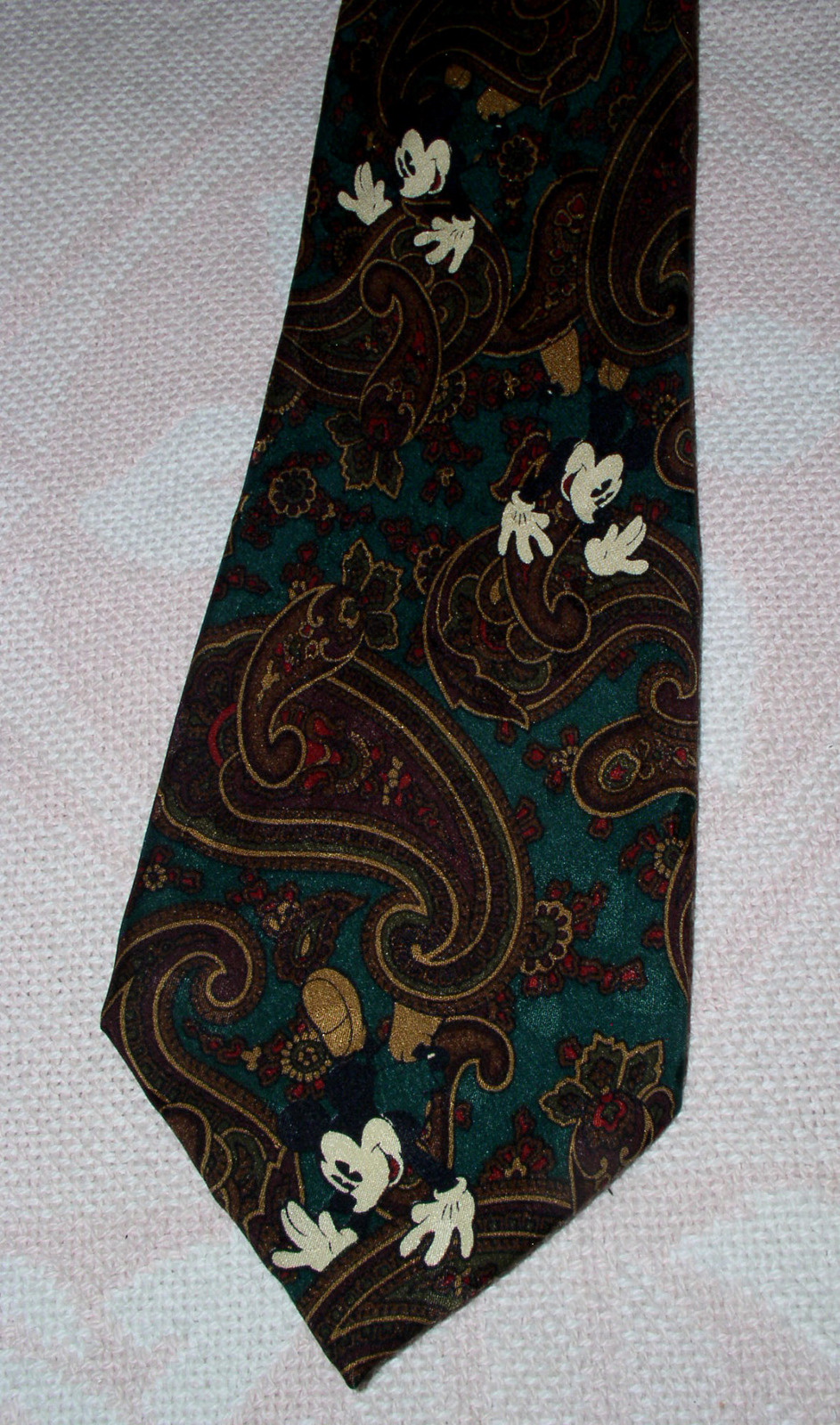 Mickey Mouse The Disney Store - Green Paisley - 3 1/2" wide, 61" long. Fabric is 100% silk. Note: Safety pin on the back to hold label in place. Could easily be sewn if buyer wants to.