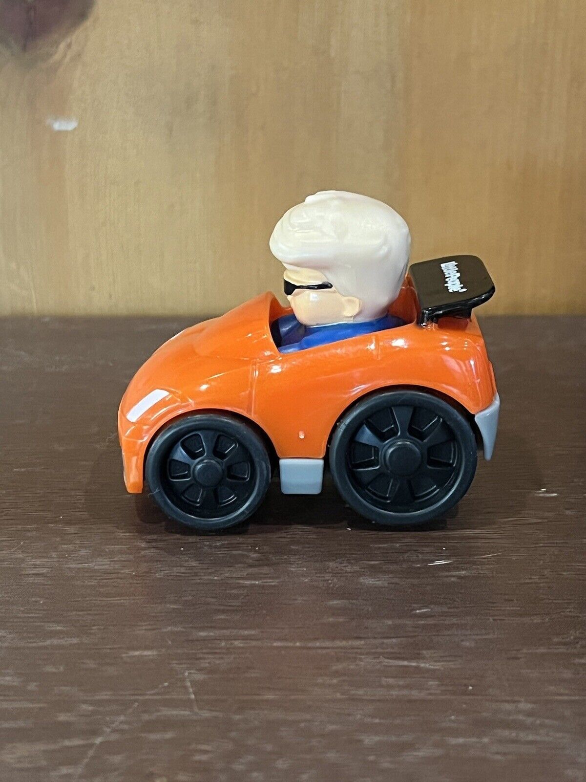 2009 Fisher Price Little People Wheelies orange race car driven by a blonde boy wearing a blue shirt and sunglasses. Very good condition.