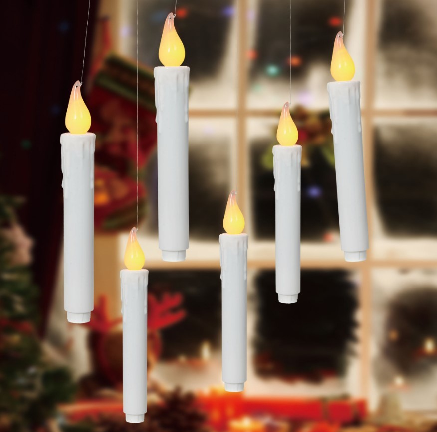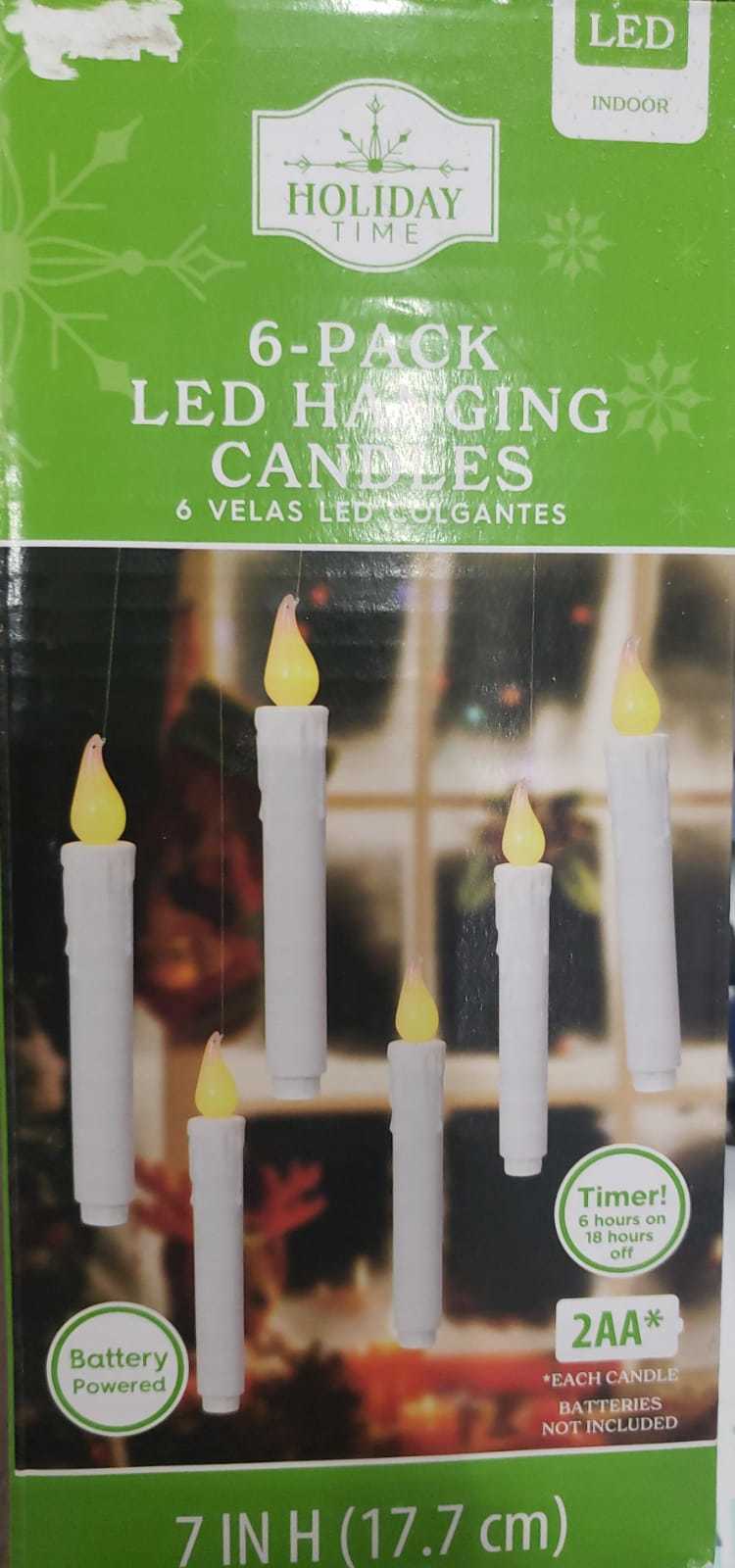 Add the Holiday Time 6-Count Hanging Candles, with Warm White Flickering LED Bulbs Christmas decor this holiday season. Ideal for indoor use, these 7-inch candles are intended to look like they are floating in thin air. The set comes with 3 feet of clear hanging line and a hook for each candle so that you can adjust them to hang at just the right height. Equipped with a timer, you wont have to climb up to turn these candles off. Each candle requires 2 AA batteries (not included) to give the warm flickering flame an authentic look.
