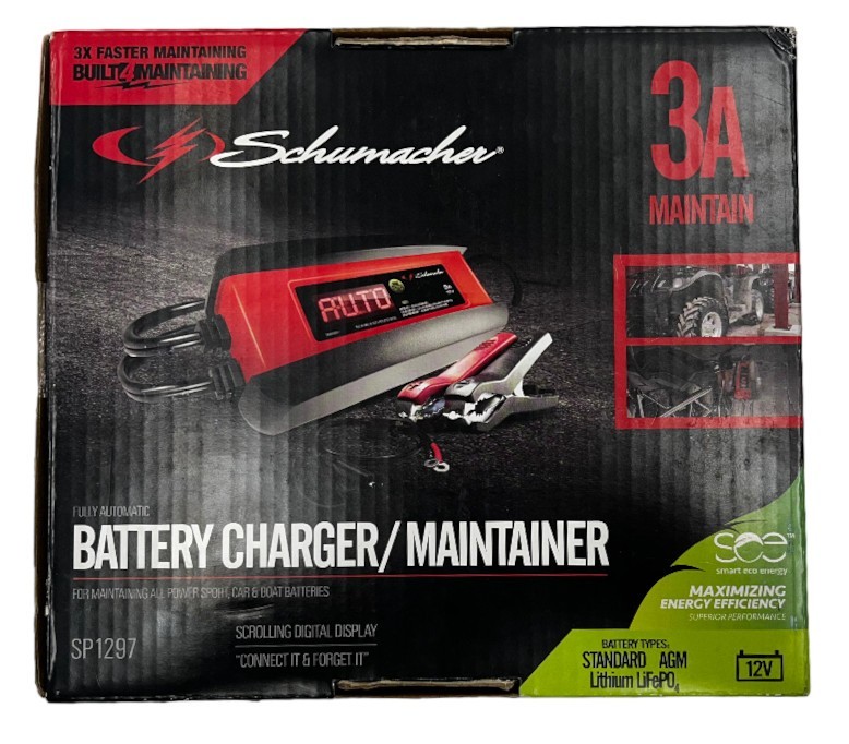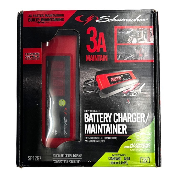 Category: Auto service toolsType: Battery chargerBrand: SchumacherModel number: SP1297Size: 3ampColor: Red/BlackPower source: ElectricCondition:New (Sealed)