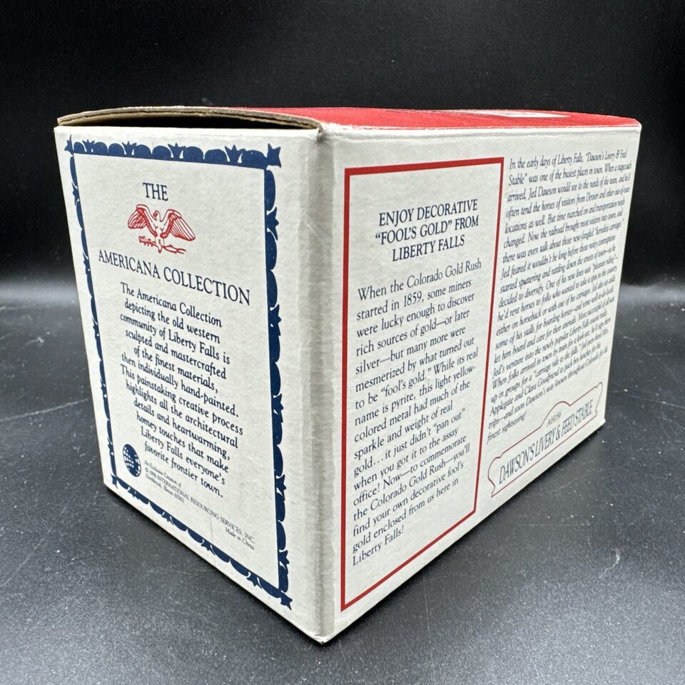 Add this charming Liberty Falls Collection piece to your village display this Christmas! The AH156: Dawson's Livery Feed Stable "Fool's Gold" is a beautiful addition to any room, made of durable resin and designed to look just like a real miniature building. This piece is perfect for collectors who love to create their own villages and want to add a touch of Gold Nuggets to their display.