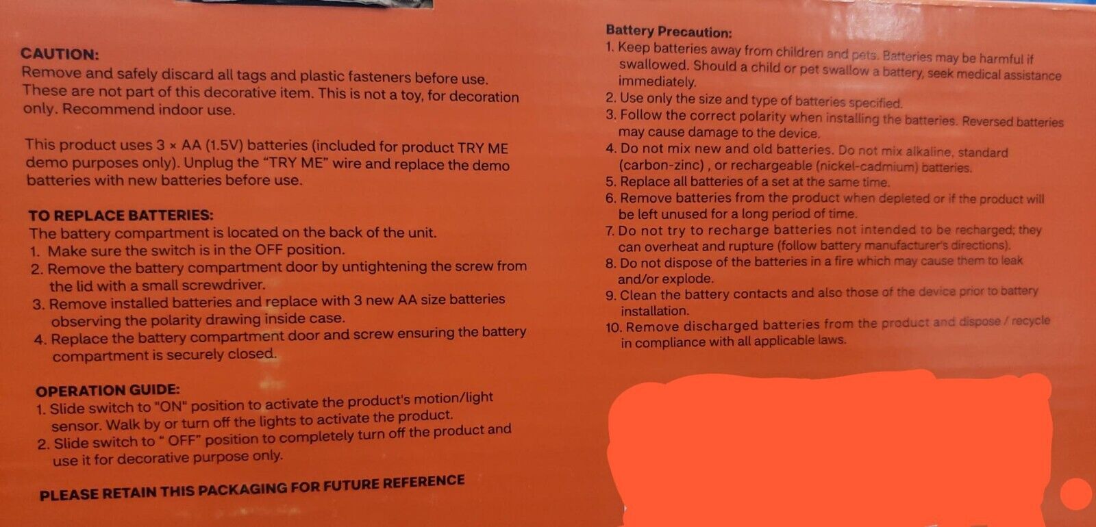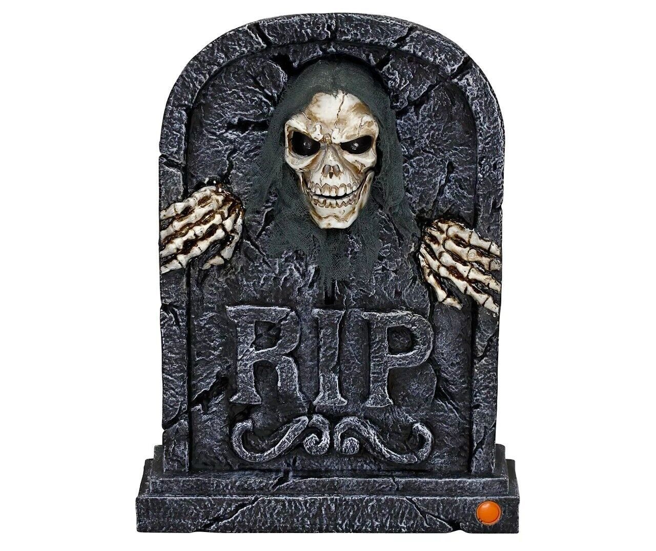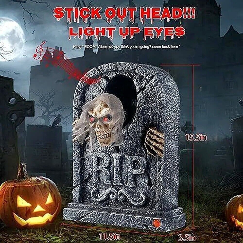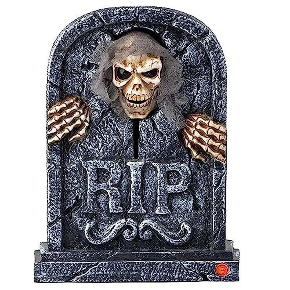 Don't walk pass this tombstone - you'll be in for a scare! A skeleton's face emerges from a crackling headstone, moving forward while illuminating from LED lighting and quipping creepy phrases. This haunting addition is a frightening delight to your Halloween decor.