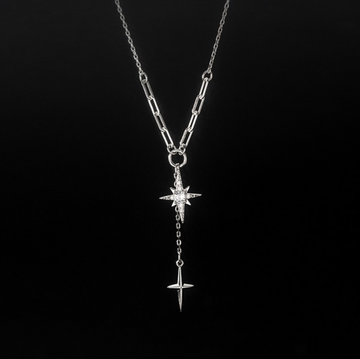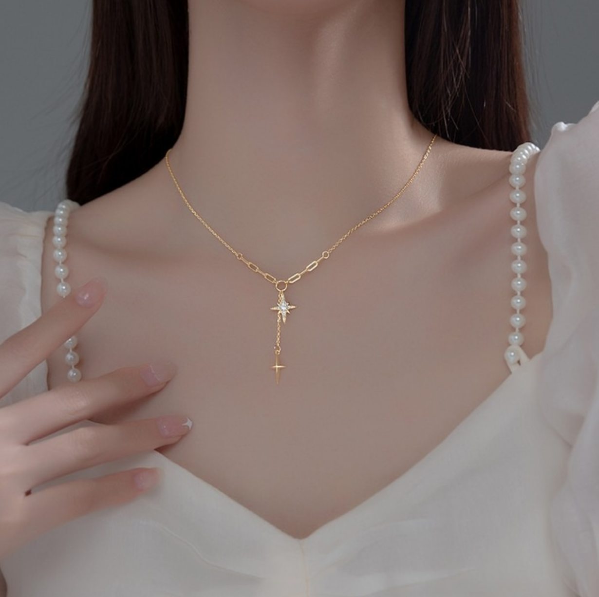 Exquisite 18K 925 Sterling Silver Star Cross Tassel Pendant Choker (Silver/Gold)