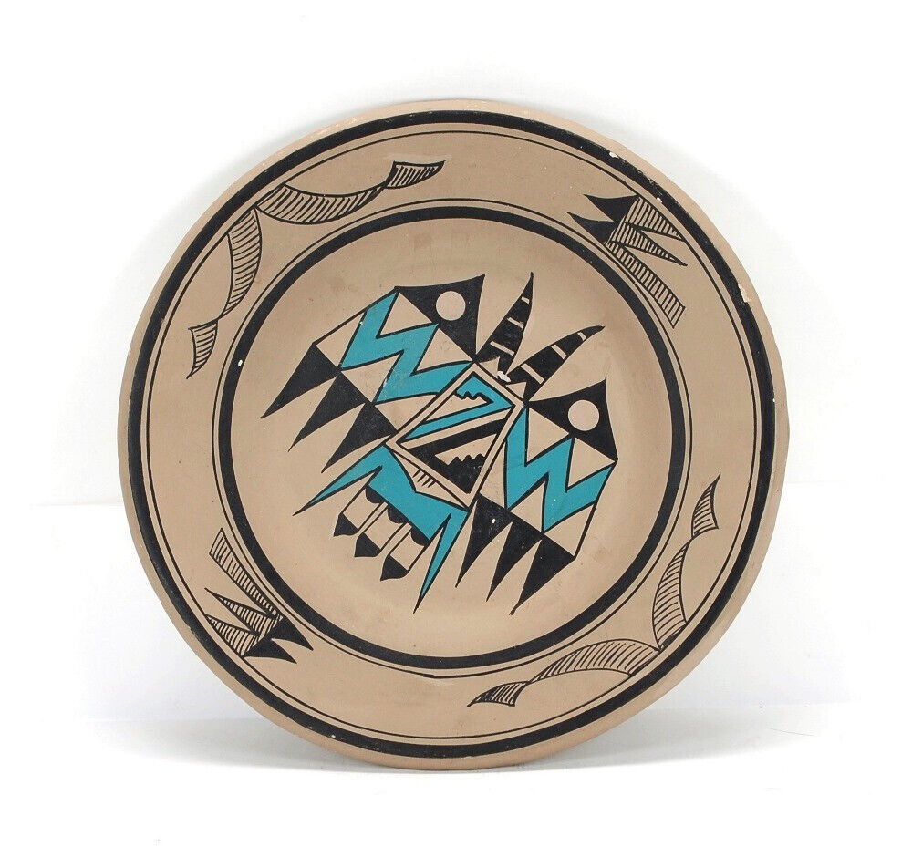 The plate was made in Mexico and created in the Native American Southwest Pueblo style. The clay coloring is the background for the hand painted design in black and turquoise blue.