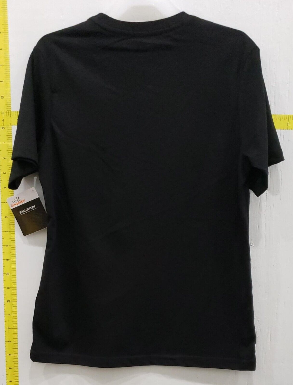 The black t-shirt has a solid pattern and is adorned with a Halloween-themed graphic,