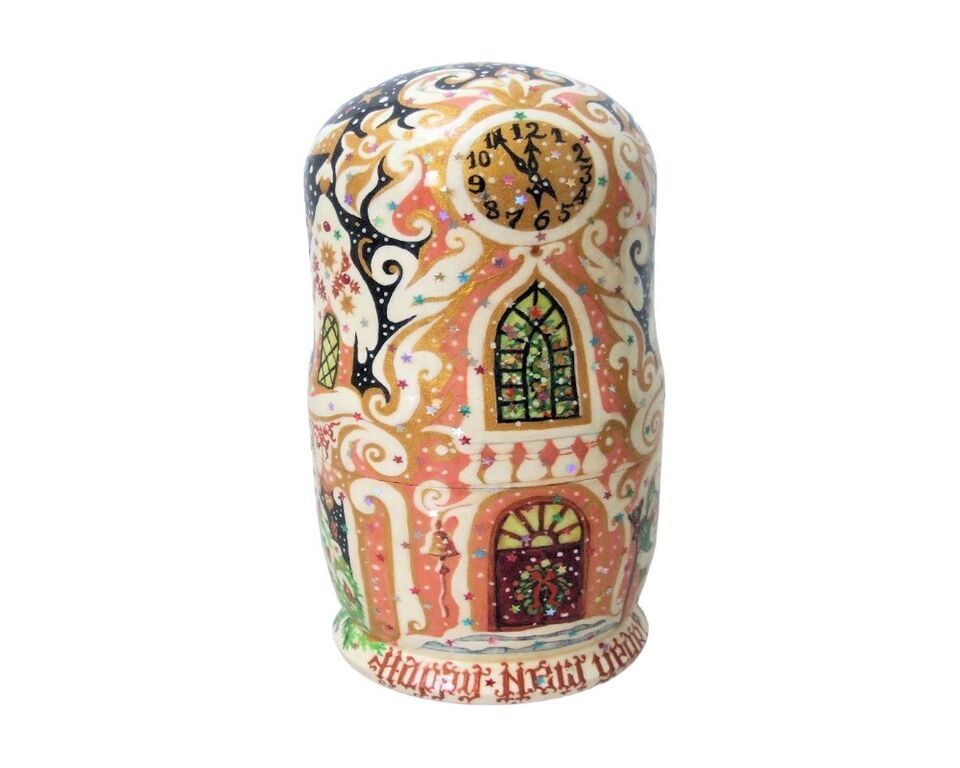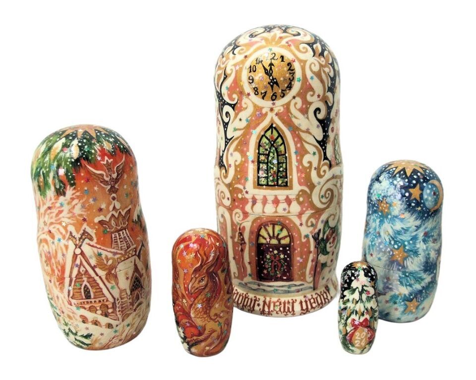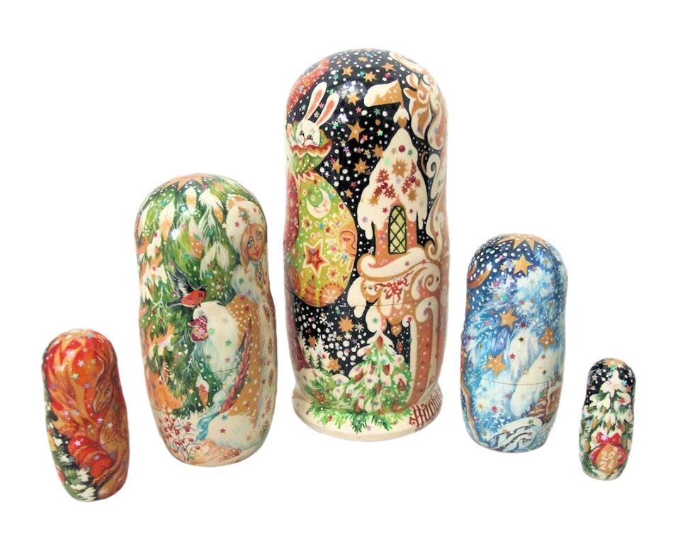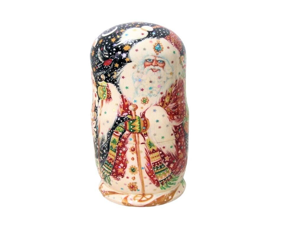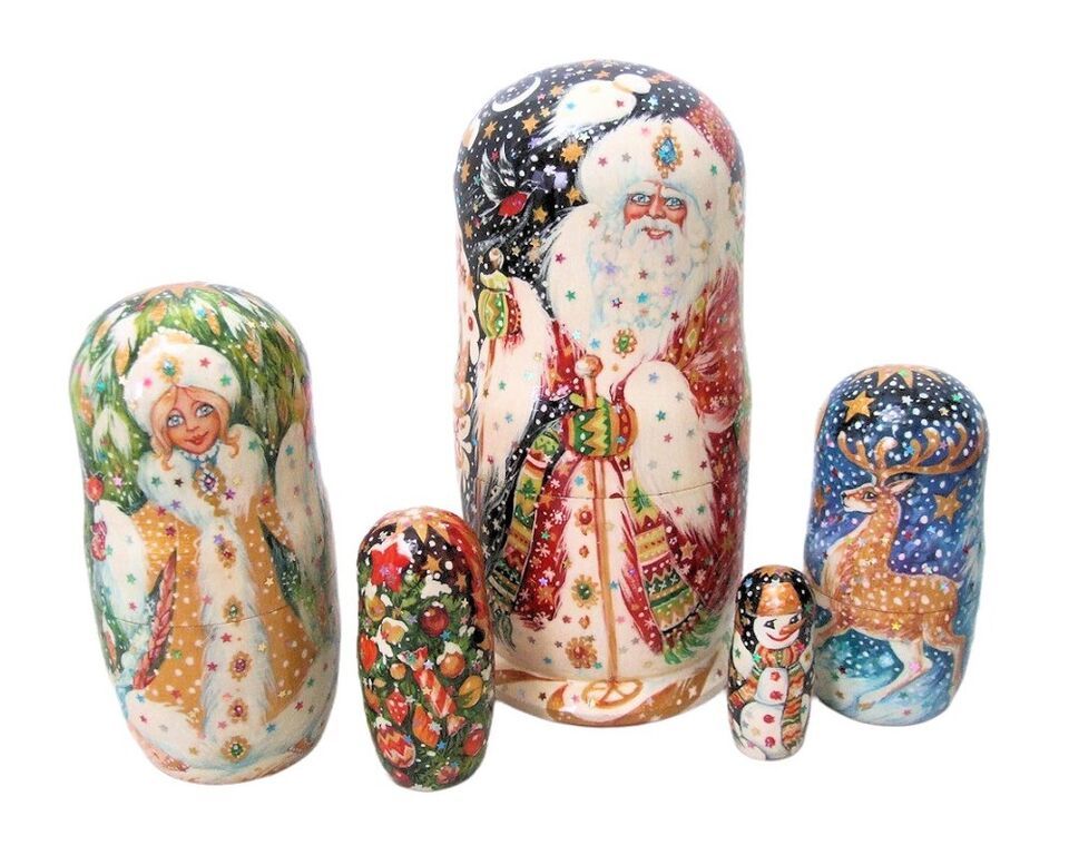 A 5pcs Russian Nesting Doll of Santa carry a bag of gifts through the village visiting the children is featured on the first doll, second doll the snow maiden, third doll is a reindeer, Fourth doll is a dragon, and the last doll is a painted snow man. The set is hand painted by Russian artists in the village of Sergiev Posad. The size of the biggest doll the first one is 7.5 inches tall (19 cm) tall and each doll gets smaller as the set is opened. Made in Russia. Any patches in the photos are from the camera's light reflection.