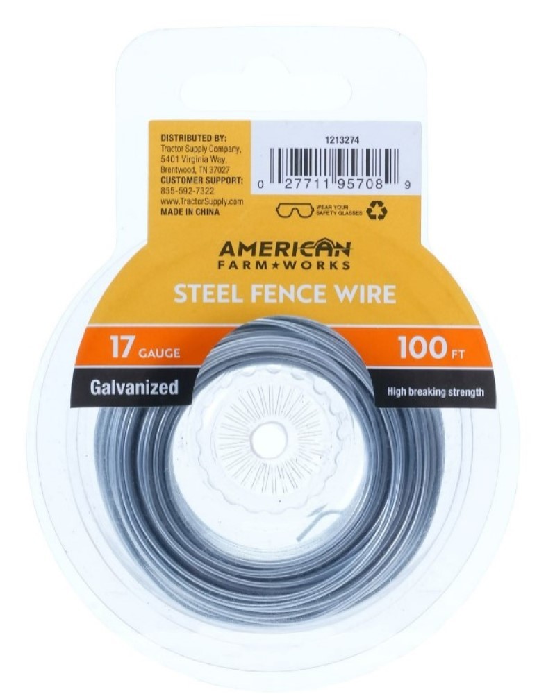 Basic, economical fence wire suits all standard electric fencing needs Compatible with plastic or porcelain insulators on all fence post types Crafted from durable galvanized steel Coil contains 100 ft. of American FarmWorks 17 gauge wire Breaking load: 95 - 120 lb. Tensile strength: 50,000 - 70,000 PSI Please note: Always handle American FarmWorks electric fence wire coils with caution and wear appropriate safety gear, including gloves and safety glasses.