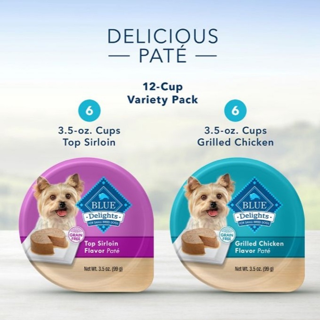 REAL BEEF OR CHICKEN FIRST: This grain-free wet dog food features high-quality protein from real beef or chicken to promote healthy muscle maintenance while supporting the higher energy needs of small-breed dogs SINGLE SERVING MEALS: BLUE Delights small breed adult dog foods are perfectly portioned for smaller dogs making them easy and convenient to serve NATURAL DOG FOOD: All BLUE dog foods are made with the finest natural ingredients and enhanced with vitamins and minerals WHOLESOME INGREDIENTS: BLUE wet dog food contains NO chicken (or poultry) by-product meals, NO corn, wheat (a common thickening agent used by other brands), or soy, and NO artificial flavors or preservatives Contains one (1) variety pack of BLUE Delights Natural Adult Small Breed Wet Dog Food Cups, Top Sirloin Flavor in Savory Juice, and Grilled Chicken Flavor in Savory Juice 3.5 oz. (12pack- 6 of each flavor)