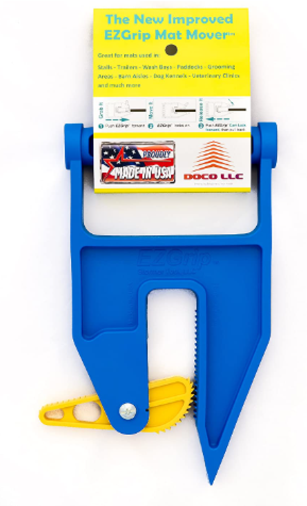 The EZGrip Stall Mat Mover is the original specially designed tool for moving heavy rubber stall mats. Made in the USA, the EZGrip livestock mat mover is as durable as it is effective. The large tooth design guarantees that EZGrip will not slip, even on old or wet rubber horse stall mats. Simply push the tool onto the mat and pull - EZGrip grabs and holds the mat until you push the release lever. One EZGrip stall mat mover will do the job, but using two will make the job even easier (additional products sold separately).