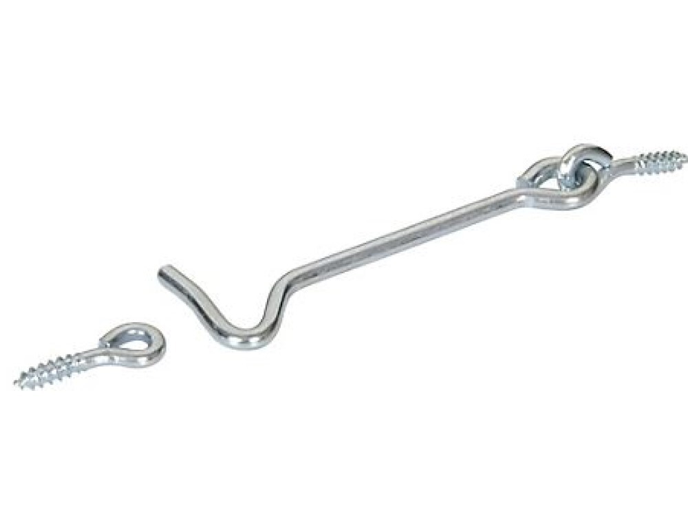 Hardware Essentials Hook and Eye Latches Zinc (6") are great for latching gates, cabinets, doors, and more. These robust latches are available in different finishes. Installation tip: drill a pilot hole before use.