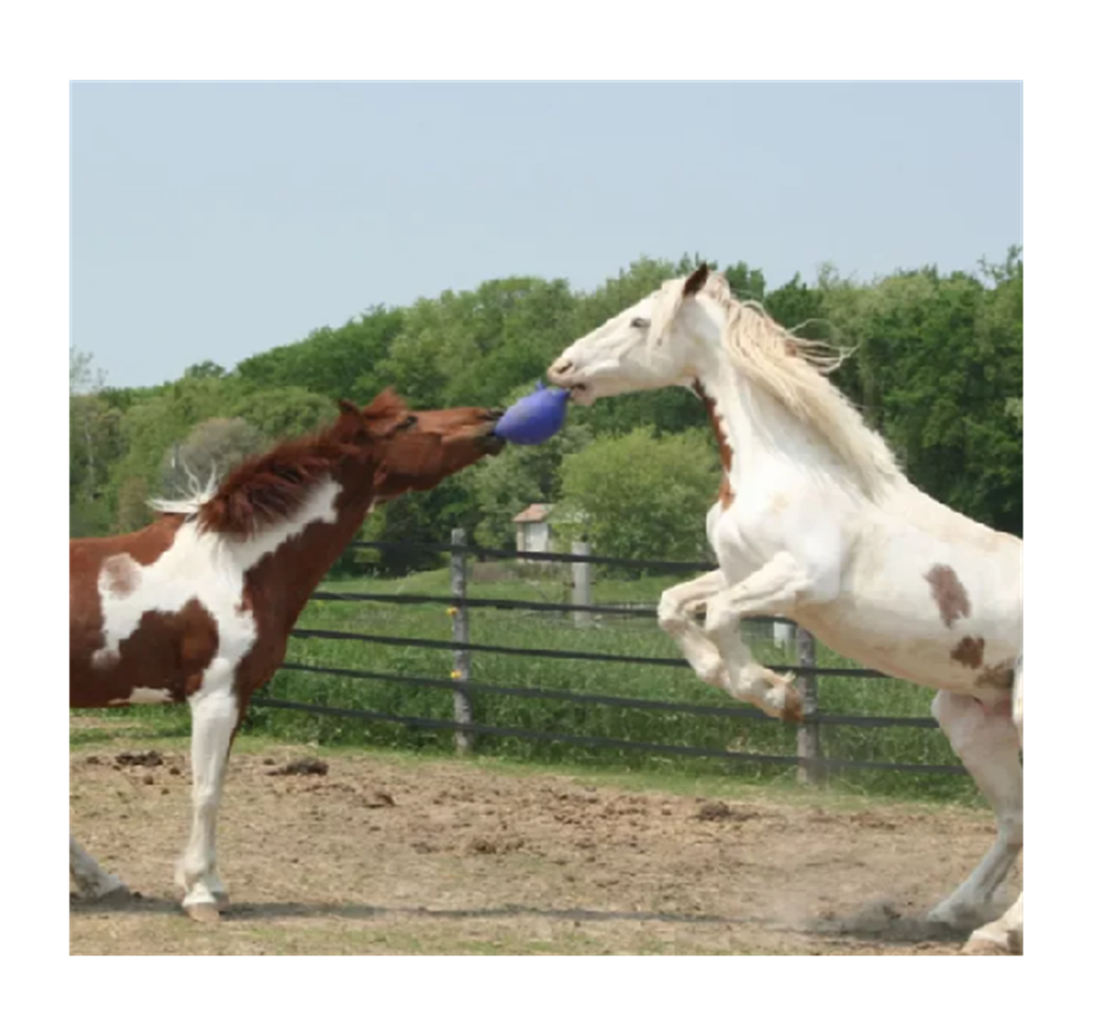 The Horsemen's Pride Jolly Ball Dual Dog and Horse Toy is great for playing in the pasture or mounted in the stall. These horse stall toys are perfect for use with large dogs as well. Made of LLDPE material for durability, this toy is ideal for animals of all life stages.